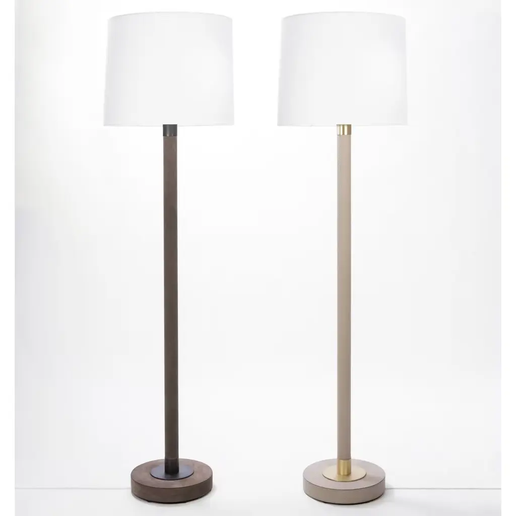 This sophisticated floor lamp is a stunning addition to a modern decor, where it can be used anywhere in the house. Its wooden structure features an in-line foot switch, a round base, and an elongated central stem upholstered in leather with bronze-finished metal inserts ending in a fine white cotton lampshade with a fireproof diffuser. The metal is also available with a chrome or brass finish. The E27 max 100W lightbulb is not included.