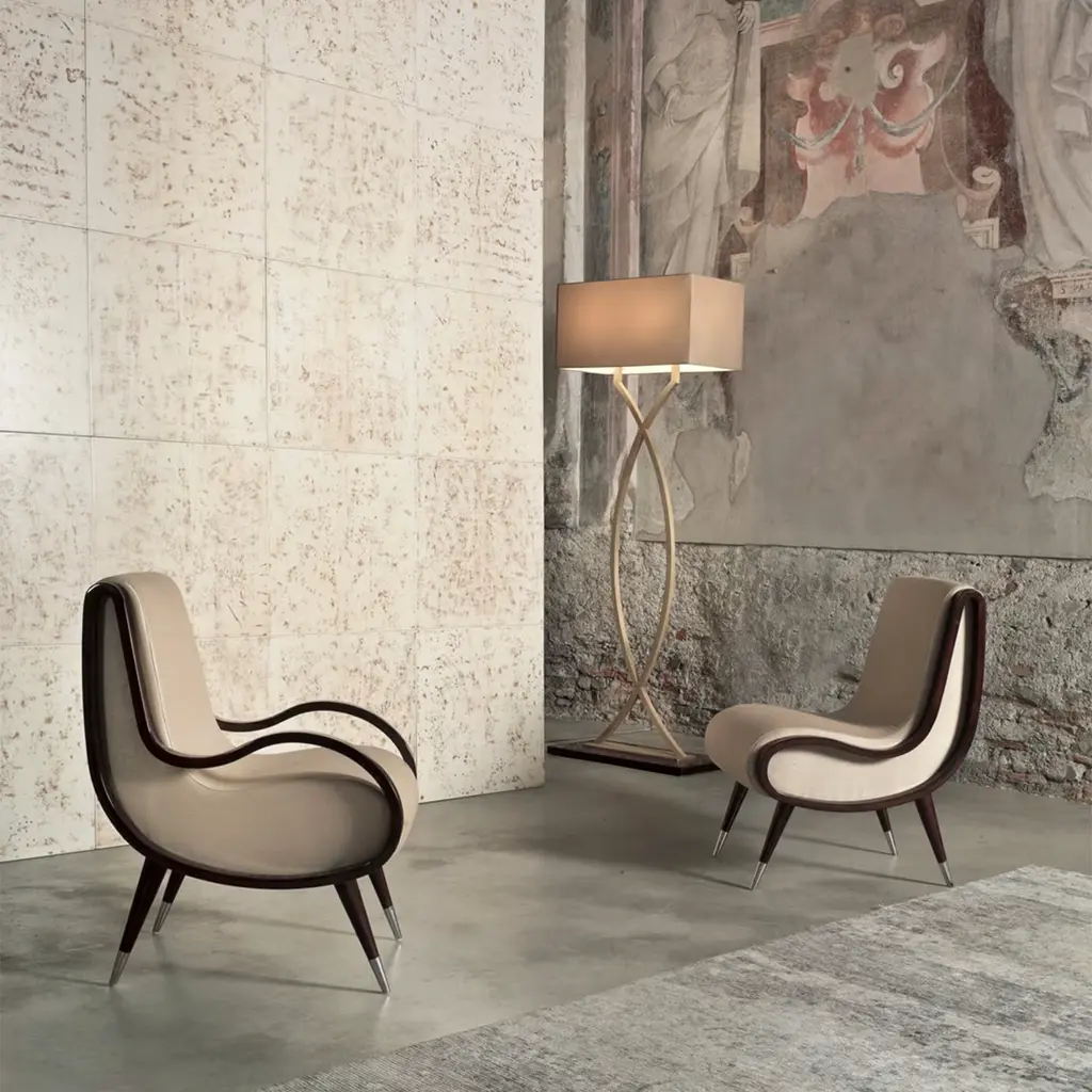 Standing tall on a goatskin base in a dark mocha tone, the Gamma Brass Floor Lamp sets an elegant tone in a traditional or contemporary living room. The lamp features an original stem, with two gently arching pieces of brass with a satin finish, topped with a fabric drum shade. Stainless steel and nickel versions of the lamp are also available.