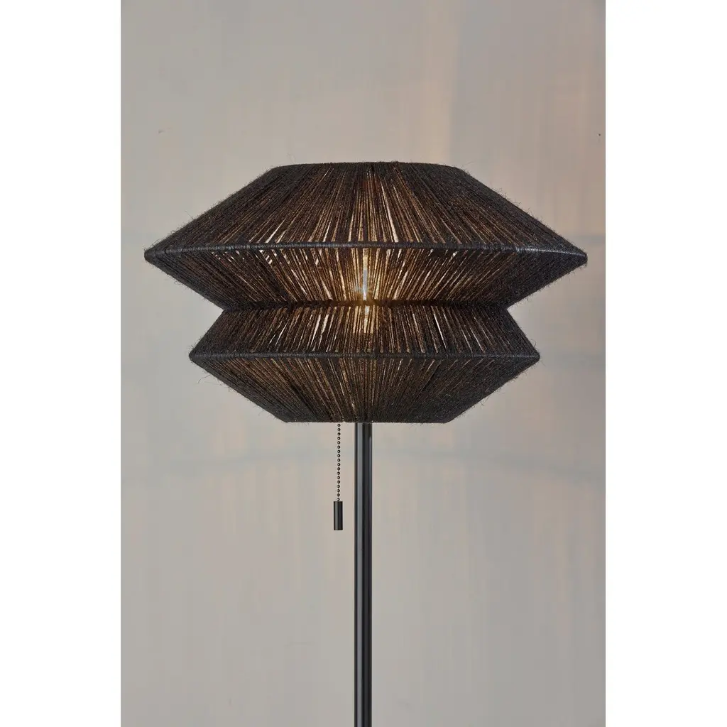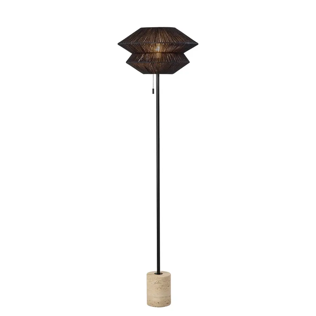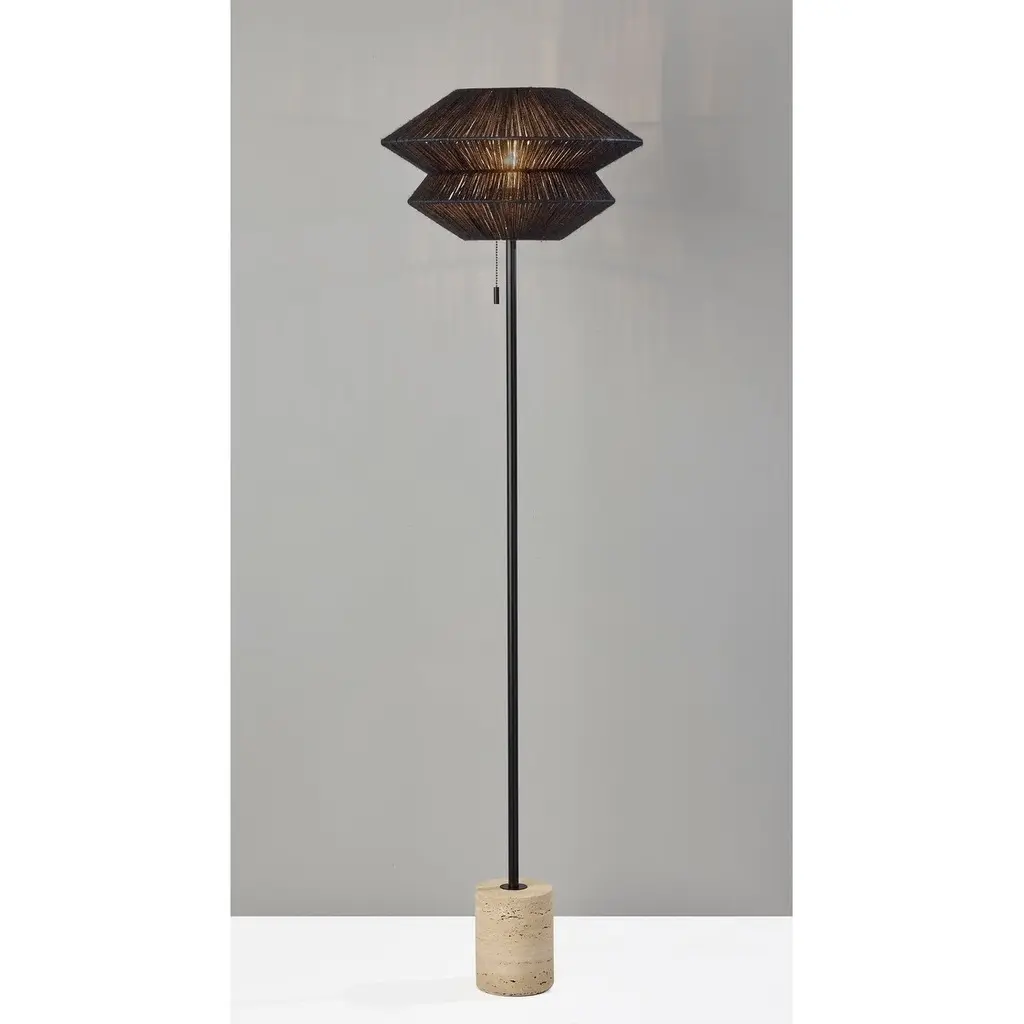 Introducing the 3870-01 Gardner Floor Lamp, where contemporary design meets natural elements. With its sleek black finish and origami-shaped black rope shade, this floor lamp adds a modern edge to any room. The chunky travertine stone base not only provides stability but also adds a touch of organic charm to the overall aesthetic. Equipped with an On/Off pull chain switch for convenience, the Gardner Floor Lamp is the perfect combination of style and functionality for your living space. Modern design: Sleek black finish and origami-shaped black rope shade offer a contemporary aesthetic. Natural elements: Chunky travertine stone base adds texture and organic appeal to the lamp. Convenient operation: On/Off pull chain switch allows for easy control of illumination. Versatile placement: Tall 63" height makes it suitable for placement in various areas of the home. Ambient lighting: Provides soft, diffused light ideal for creating a cozy atmosphere in any room.