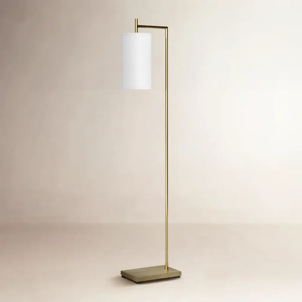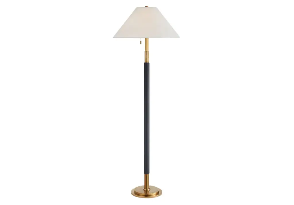 Straightforward and distinctive, the Garner Lamp features a natural brass form complemented by a deep navy leather accent, topped by a tapered percale shade and brass pull chain. Pair two together in a living room or bedroom for a handsome, cultivated design. Dimensions: 22” W | 54”-70” HBase: 10” RoundShade: 6.75" W | 22" W | 12.25" H