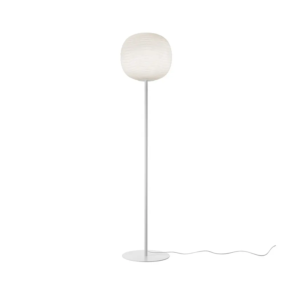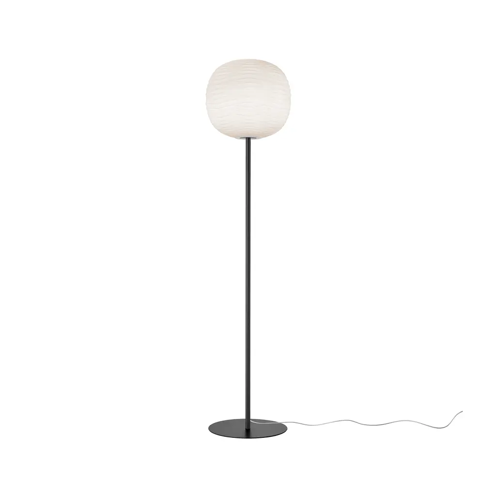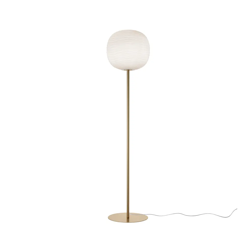 Designed by Ludovica + Roberto Palomba, Gem turns a simple globe of blown glass into something almost geological. Each diffuser is hand-shaped while the glass is still molten, imprinting it with a crystalline ripple pattern that catches daylight like water and glows at night with a soft, ember-like warmth. The shade sits on a slender metal stem and a low, satin-finished base—details kept deliberately quiet so the textured glass can do all the talking. Switch Gem on and the relief work comes alive: light pools inside every ridge, then filters outward in a calm, even wash that flatters living-room corners, bedroom reading nooks, or hotel lounges. Three stem/ base finishes (satin gold, warm bronze, or matte graphite) let you tune the mood from understated elegance to dramatic contrast, and the dimmable E26/LED source makes it easy to shift from evening ambience to practical task lighting. Standing just over five feet tall with a discreet footprint, Gem is substantial enough to anchor a seating area yet refined enough to slip into smaller spaces. Pair it with the matching table lamp or wall sconce from Foscarini’s Mix & Match series for a cohesive glow that feels carved from light itself.