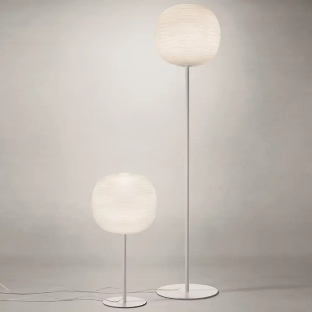 Introduce a stunning modern beauty to your home with the Gem Floor Lamp from Foscarini. An elegant and precious demonstration of light, this piece was designed by Ludovica and Roberto Palomba, a design team seeking to enhance the relationship between people and products. A blown glass shade rests upon a thin metal body and wide base. The surface of the shade is etched with acid, creating brief, undulating lines upon its surface. The single bulb within spreads a warm and tasteful ambiance.