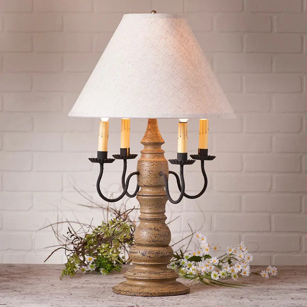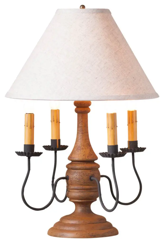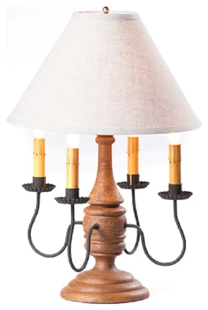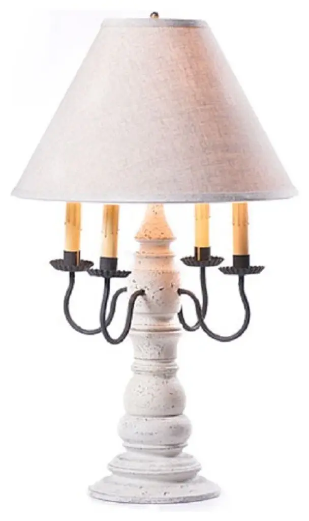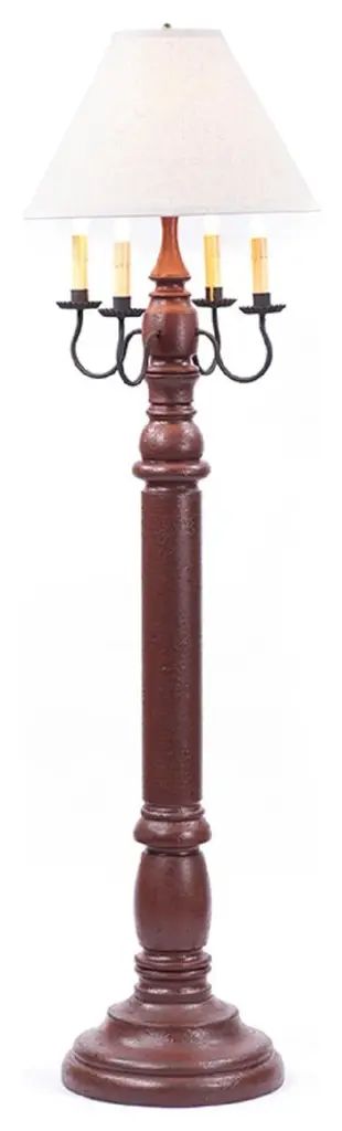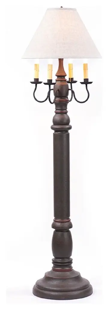 Measures 60.5-Inch high x 17-Inch diameter (with shade)Has a 7-foot cord and 3-way switch; Plugs into wall outlet; Top center has a standard socket, 1 x 150 watts max; Arms have candelabra sockets, 4 x 60 watts max. UL listed for dry locationsTextured black paint finish; Ivory Linen shade includedLamp Base is made in the USA, Shade is ImportedA large statement making floor lamp for your home. Imagine this beautiful lamp illuminating your reading nook, living room or office.Handpainted and slightly distressed finish. Center has one E26/Medium (Standard) socket, 150 watts max. The 4 arms have E12/Candelabra sockets, 60 watts max. per arm. Includes an Ivory Linen fabric 17 inch shade. Has a three-way switch, 7-foot cord, 8 inch harp and finial. Body is solid wood, arms are metal. USA made.