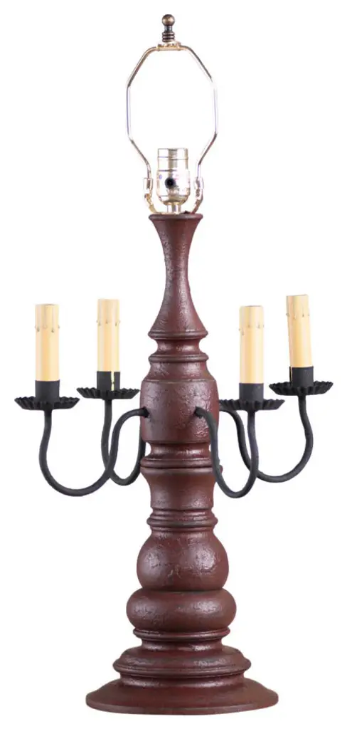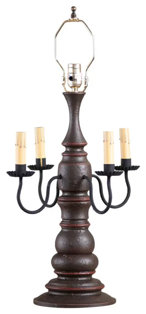 Measures 60.5-Inch high x 13-Inch diameterHas a 7-foot cord and 3-way switch; Plugs into wall outlet; Top center has a standard socket, 1 x 150 watts max; Arms have candelabra sockets, 4 x 60 watts max. UL listed for dry locationsTextured vintage white paint finishMade In USAA large statement making floor lamp base for your home. Imagine this beautiful lamp base illuminating your reading nook, living room or office.Hand painted and lightly distressed finish. Center has 1 E26/Medium (Standard) socket, 150 watts max. The 4 arms have E12/Candelabra sockets, 60 watts max per arm. Has a three-way switch, 7-foot cord, 8 Inch harp and finial. Body is solid wood, arms are metal. USA made.