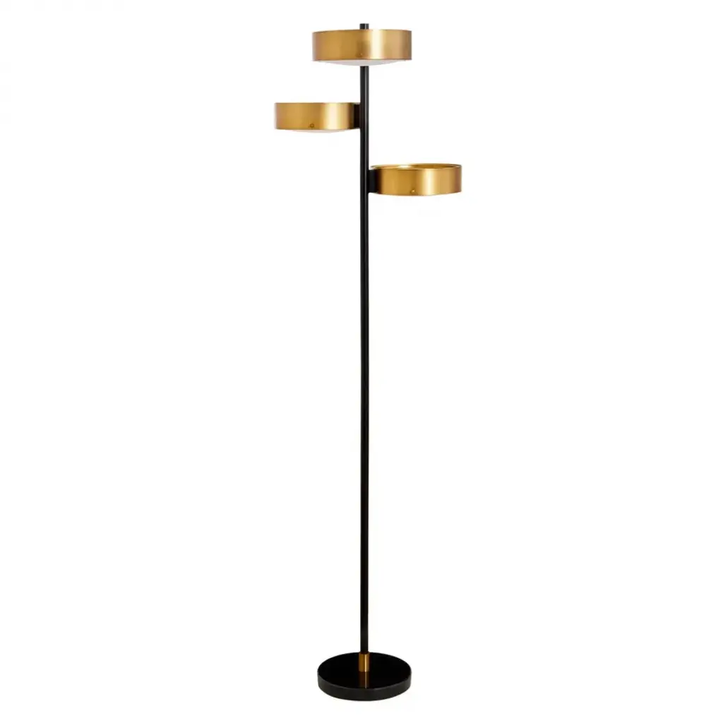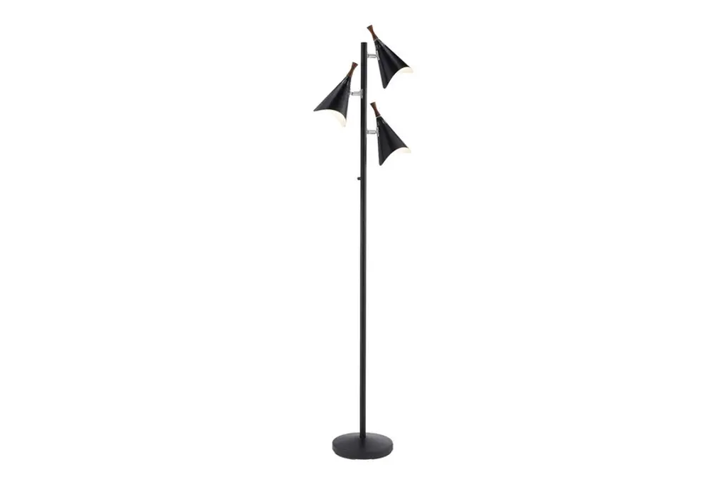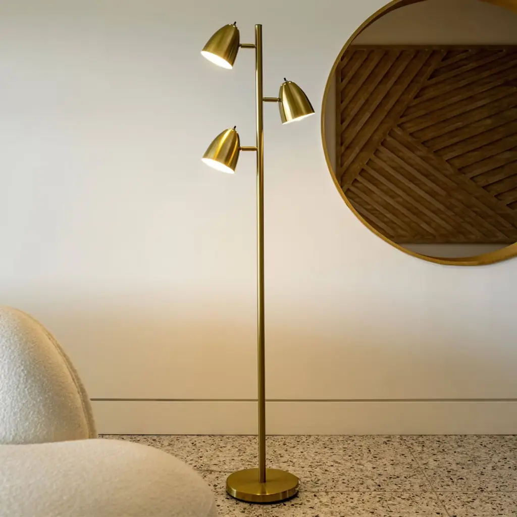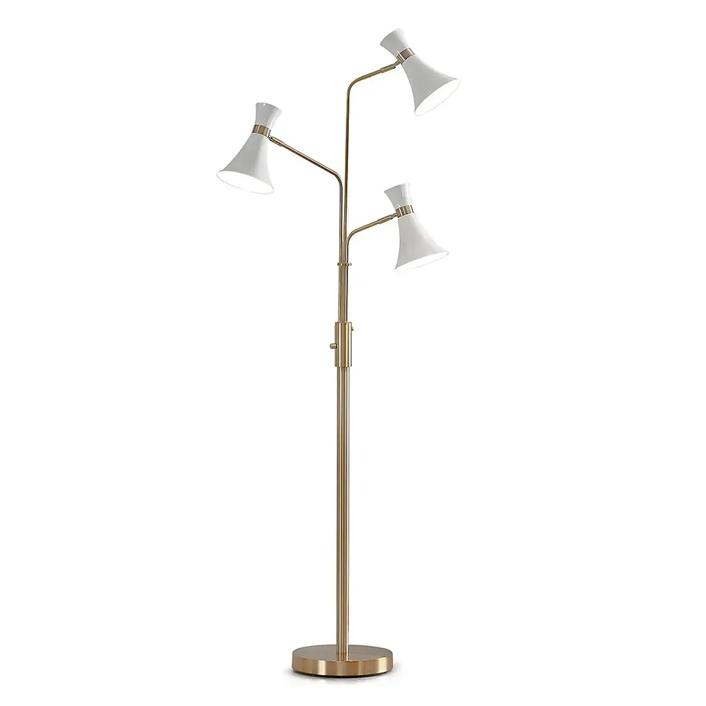 Retro glow. A sleek take on mid-century style, this floor lamp is defined by a trio of flared metal shades in a gleaming brass finish. It’s built from sturdy black steel with a convenient foot switch + a broad circular base. The shades are adjustable, so you can shine their light wherever you like.