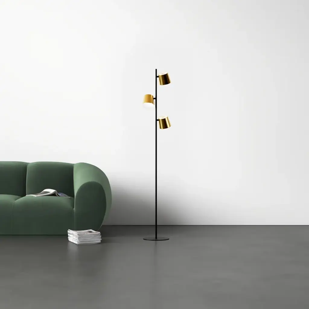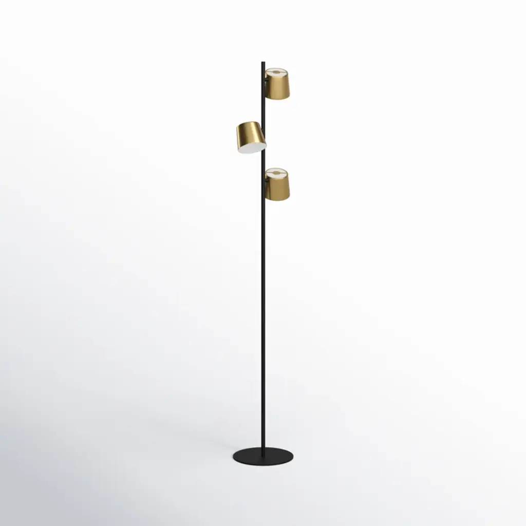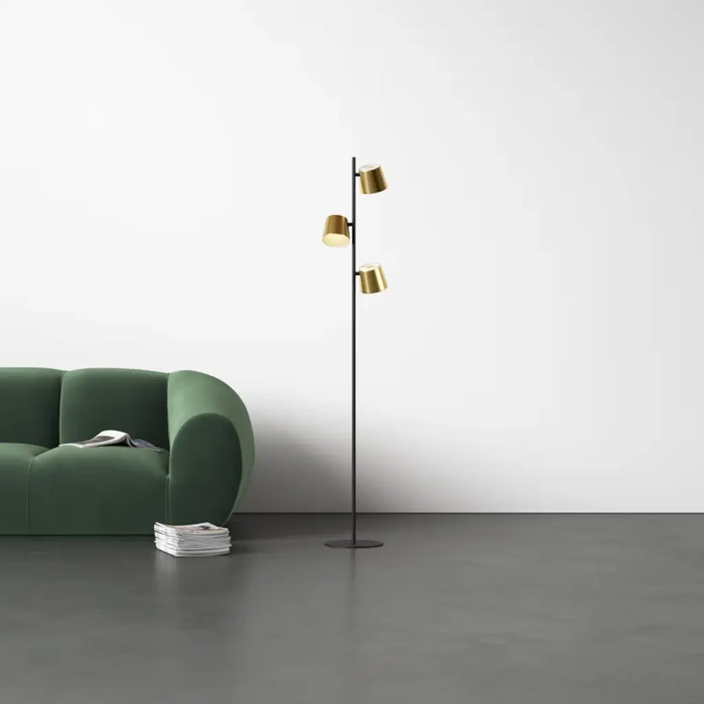 Retro glow. A sleek take on mid-century style, this floor lamp is defined by a trio of flared metal shades in a gleaming brass finish. It’s built from sturdy black steel with a convenient foot switch + a broad circular base. The shades are adjustable, so you can shine their light wherever you like.
