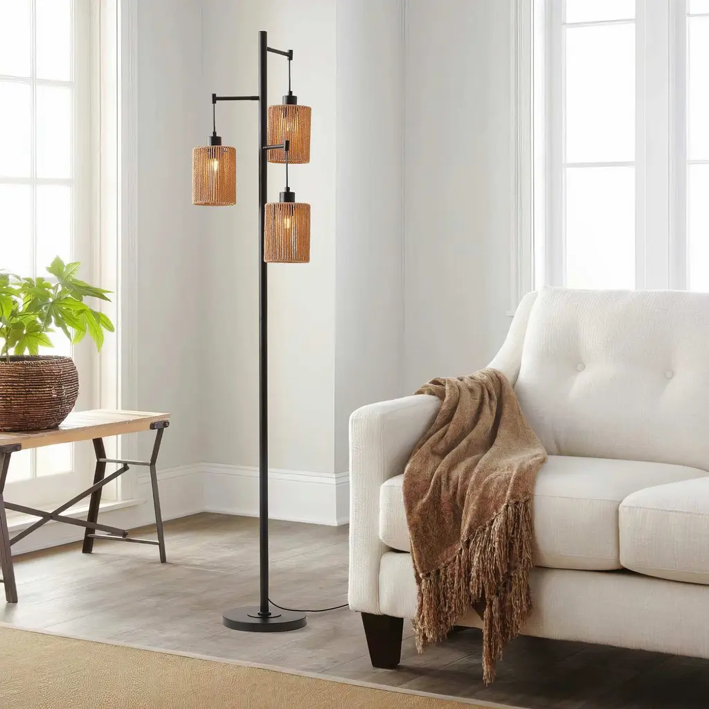 Adds a natural, textured element to your home with this tree floor lamp. Designed with three hanging hand-woven rattan shades, this lamp provides a soft and warm light, ideal for creating a cozy atmosphere. The black metal frame offers a sleek, modern aesthetic that complements any decor style. Ideal for living rooms, bedrooms, reading nooks, and home offices.Features: