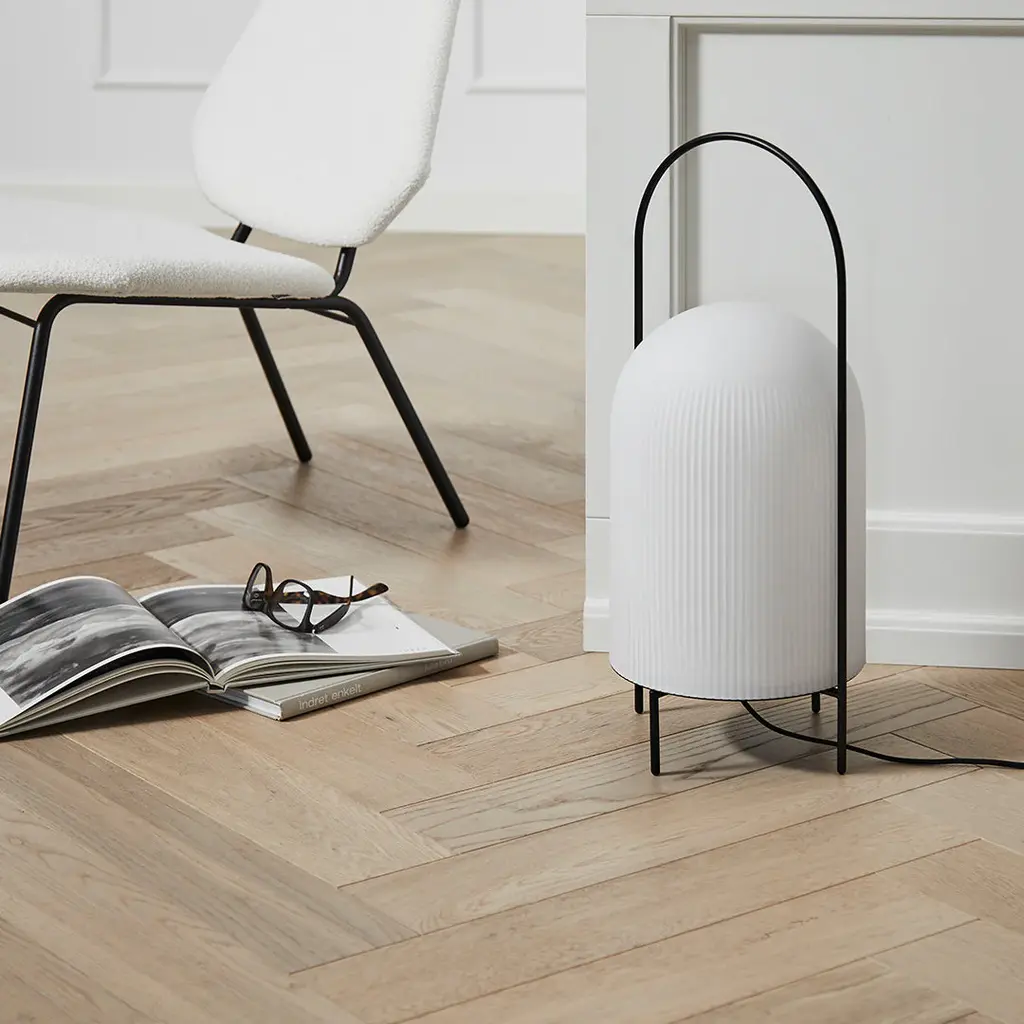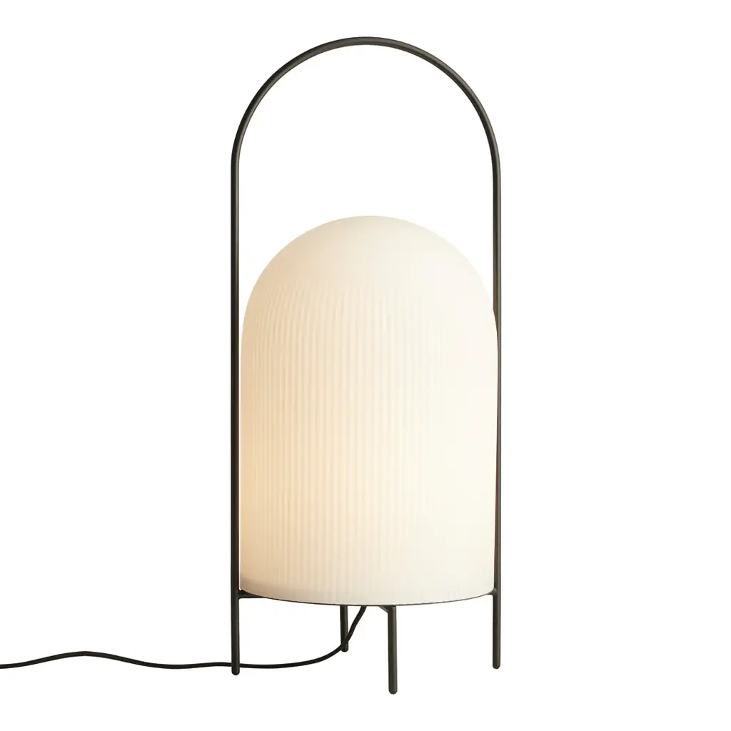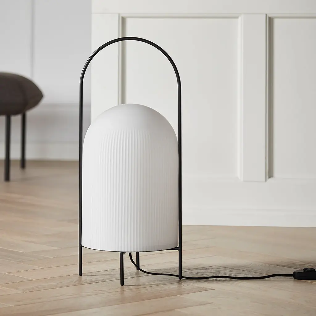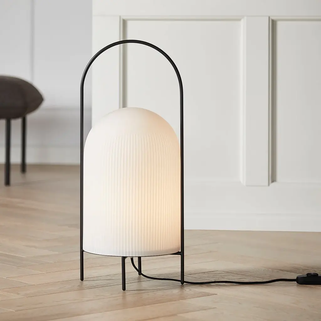 Ghost floor lamp is a modern interpretation of antique portable oil lamps. The slim metal rod surrounds the lampshade protectively while the overarching bail functions as a handle for carrying the lamp around. Made of translucent opal glass, the shade gives an illusion of a white cloth thrown over the light source. Resembling the appearance of a friendly ghost in the air. The subtle vertical groove pattern on the surface fades out gradually upwards, emphasizing the lamps refined sculptural character. The cord (98.4 L) comes with a dimmable switch.