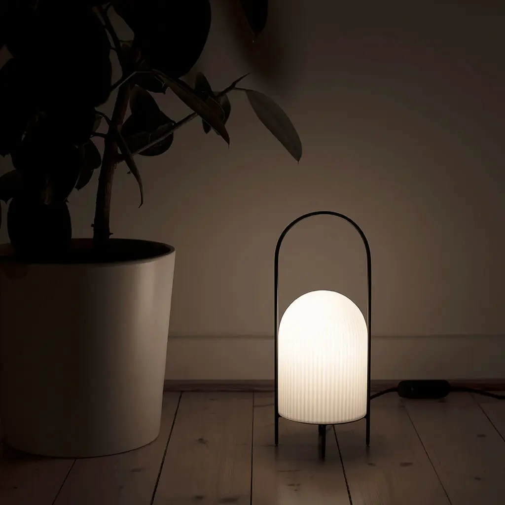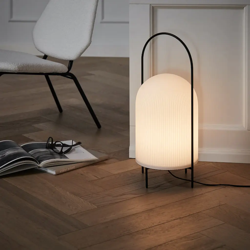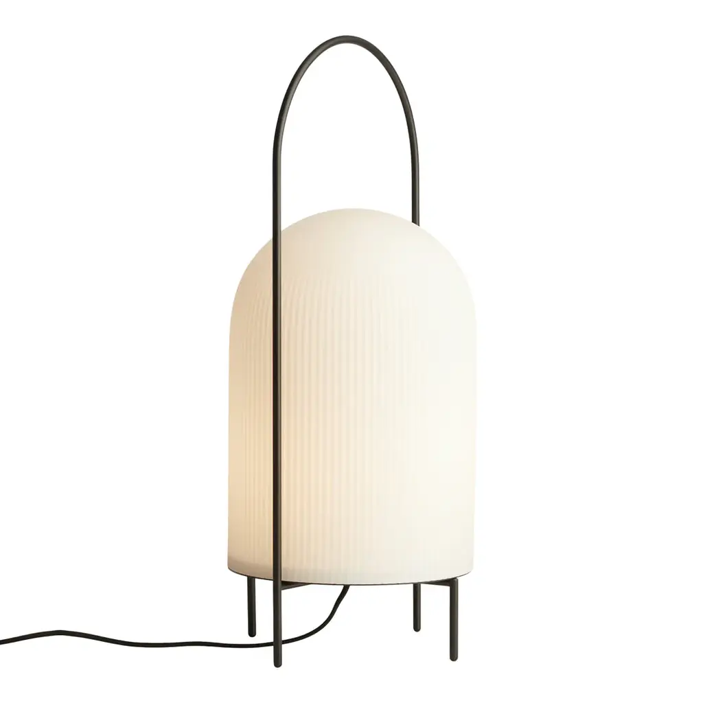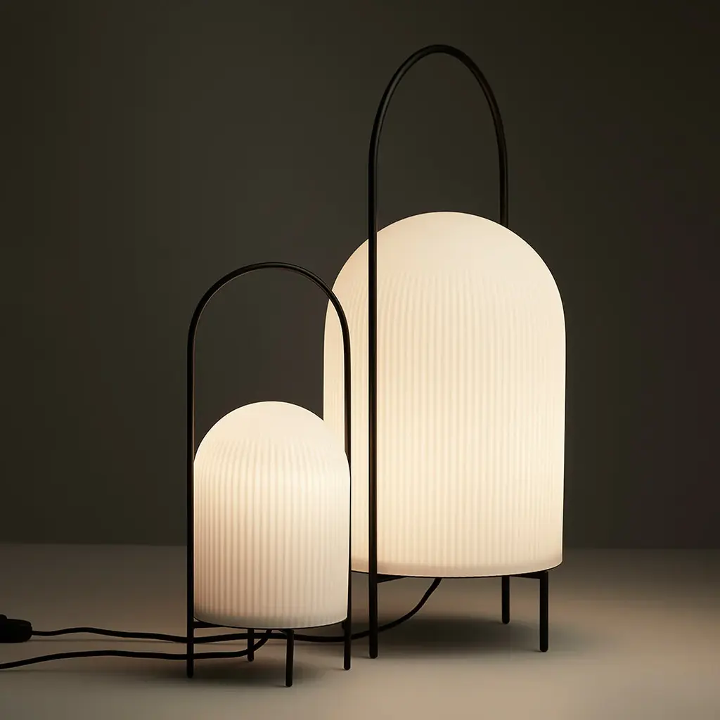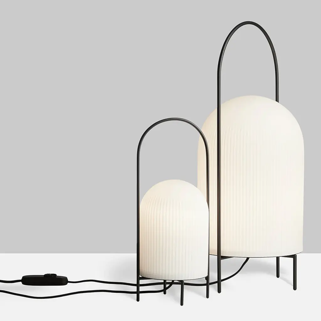 Ghost floor lamp is a modern interpretation of antique portable oil lamps. The slim metal rod surrounds the lampshade protectively while the overarching bail functions as a handle for carrying the lamp around. Made of translucent opal glass, the shade gives an illusion of a white cloth thrown over the light source. Resembling the appearance of a friendly ghost in the air. The subtle vertical groove pattern on the surface fades out gradually upwards, emphasizing the lamps refined sculptural character. The cord (98.4 L) comes with a dimmable switch.
