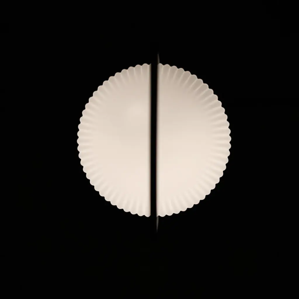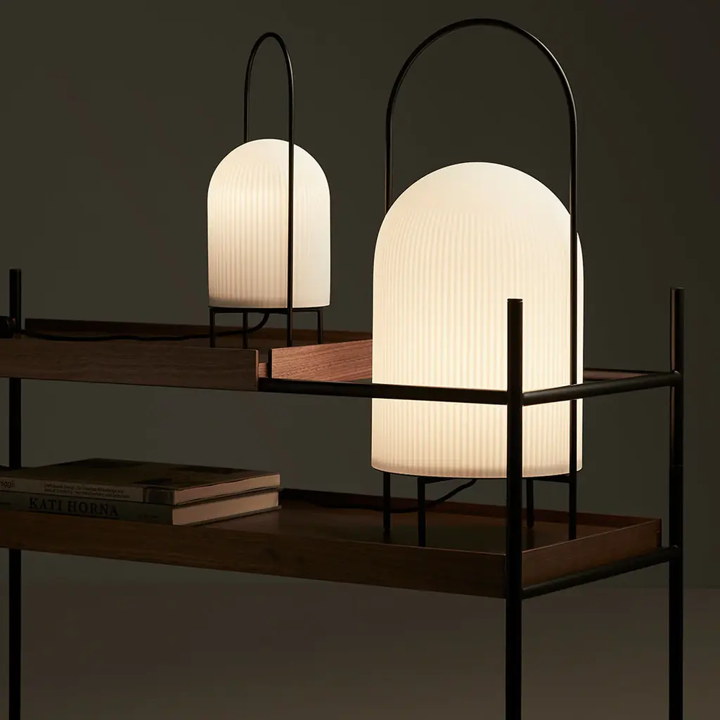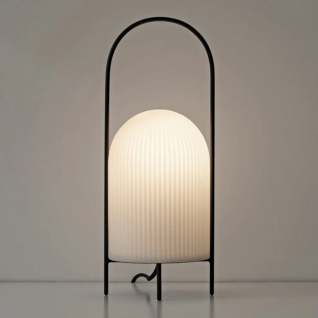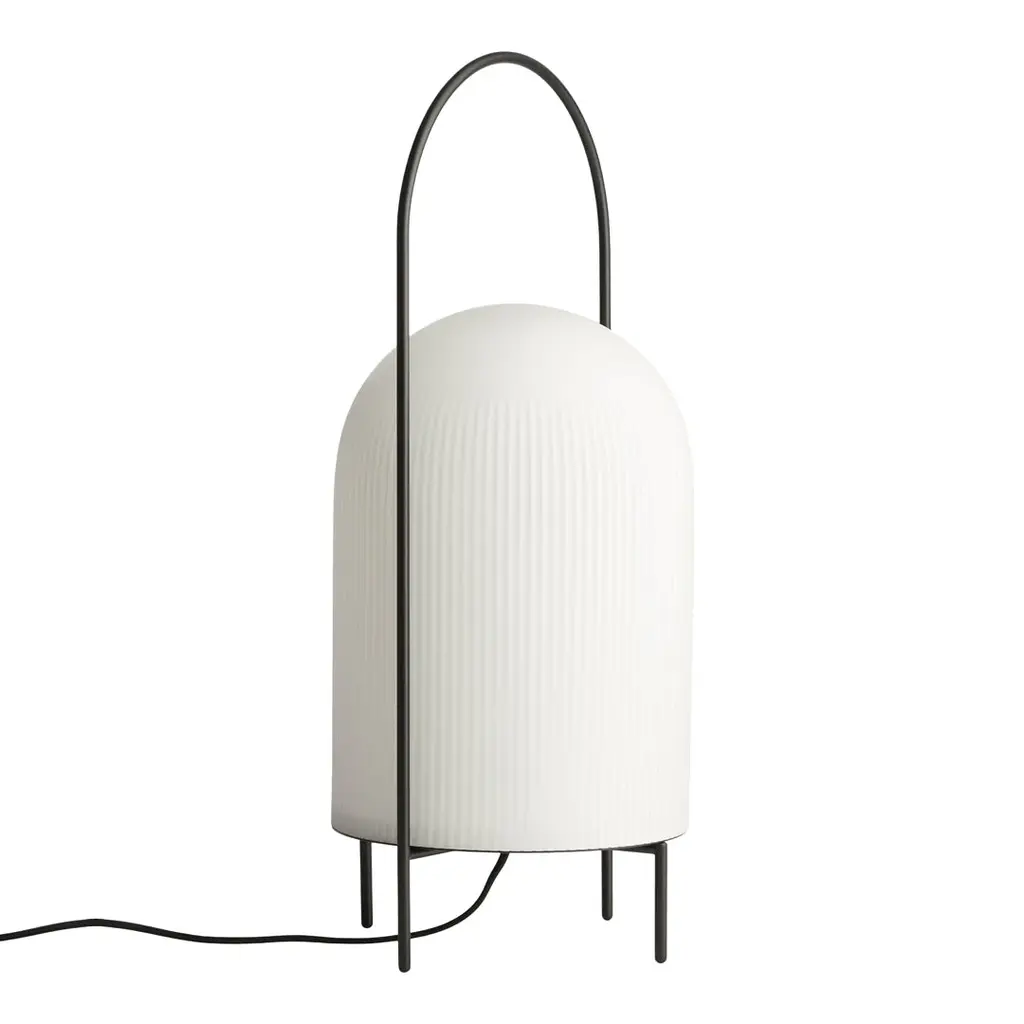 Ghost floor lamp is a modern interpretation of antique portable oil lamps. The slim metal rod surrounds the lampshade protectively while the overarching bail functions as a handle for carrying the lamp around. Made of translucent opal glass, the shade gives an illusion of a white cloth thrown over the light source. Resembling the appearance of a friendly ghost in the air. The subtle vertical groove pattern on the surface fades out gradually upwards, emphasizing the lamps refined sculptural character. The cord (98.4 L) comes with a dimmable switch.