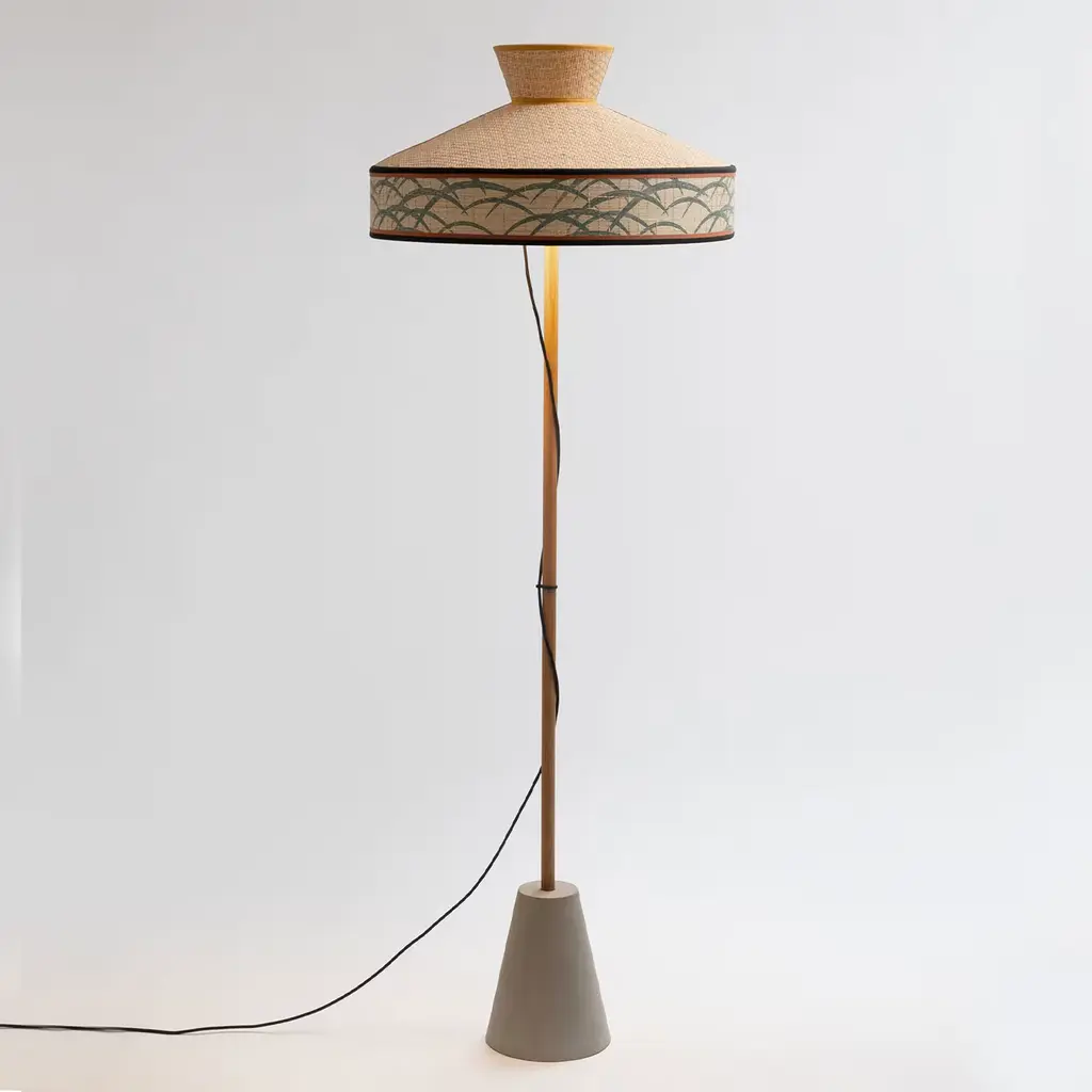 The Giardino floor lamp extends the Giardino family with three color combinations—ivory/pink, white/black, and green/black—with a new leaf motif. Its rattan and fabric lampshade with contrasting trimmings sits on an oak stem and concrete base, inspired by outdoor umbrellas. This lamp has three E27/E26 bulb holders (bulb not included) and a 2-meter black silk-like cable. It features a dimmer switch on the cable.
