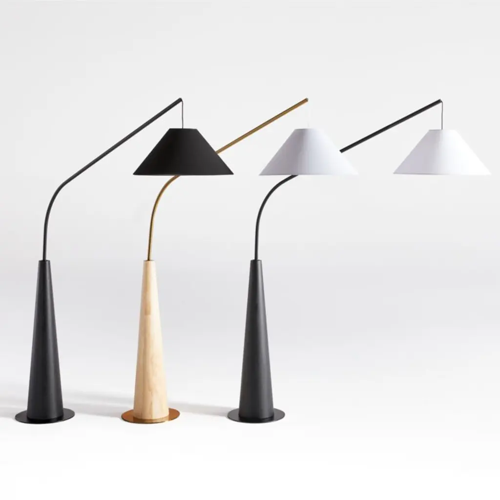 Slender blackened steel arches gracefully, supporting the black linen shade of our Gibson hanging arc floor lamp. Grounded by a tall, conical base of ebonized wood on a circle of steel, the lamp serves as a ceiling light thanks to the long reach of the overarching arm that puts illumination right where you need it. The conical shade is suspended from a black fabric cord, enhancing the floating feeling. Ideal for a sitting area, our clean-lined Gibson floor lamp is a Crate & Barrel exclusive.