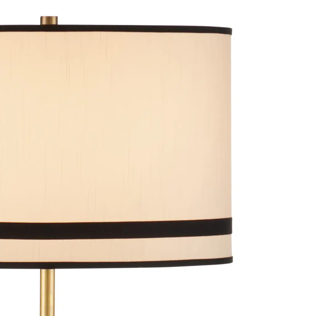 The Gieves Floor Lamp is a sophisticated blend of rich materials and timeless design. Its telescoping pedestal crafted from metal sits atop a base that matches the thin stem that rises toward a striped shade with circlets of trim.