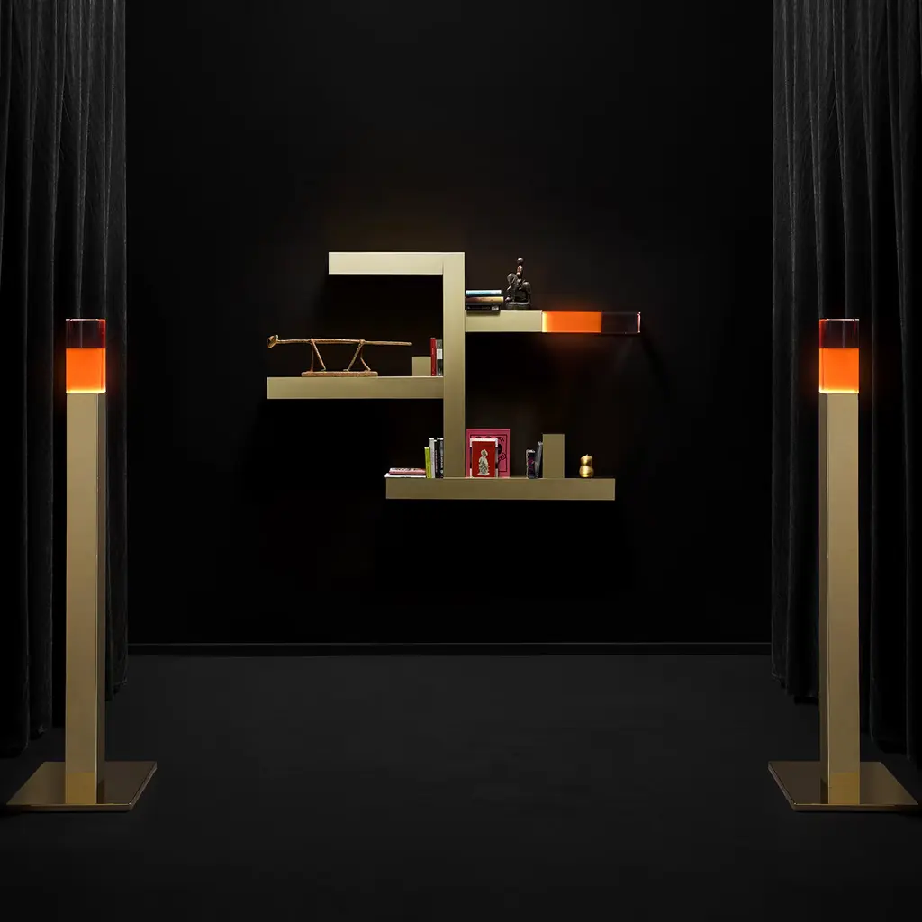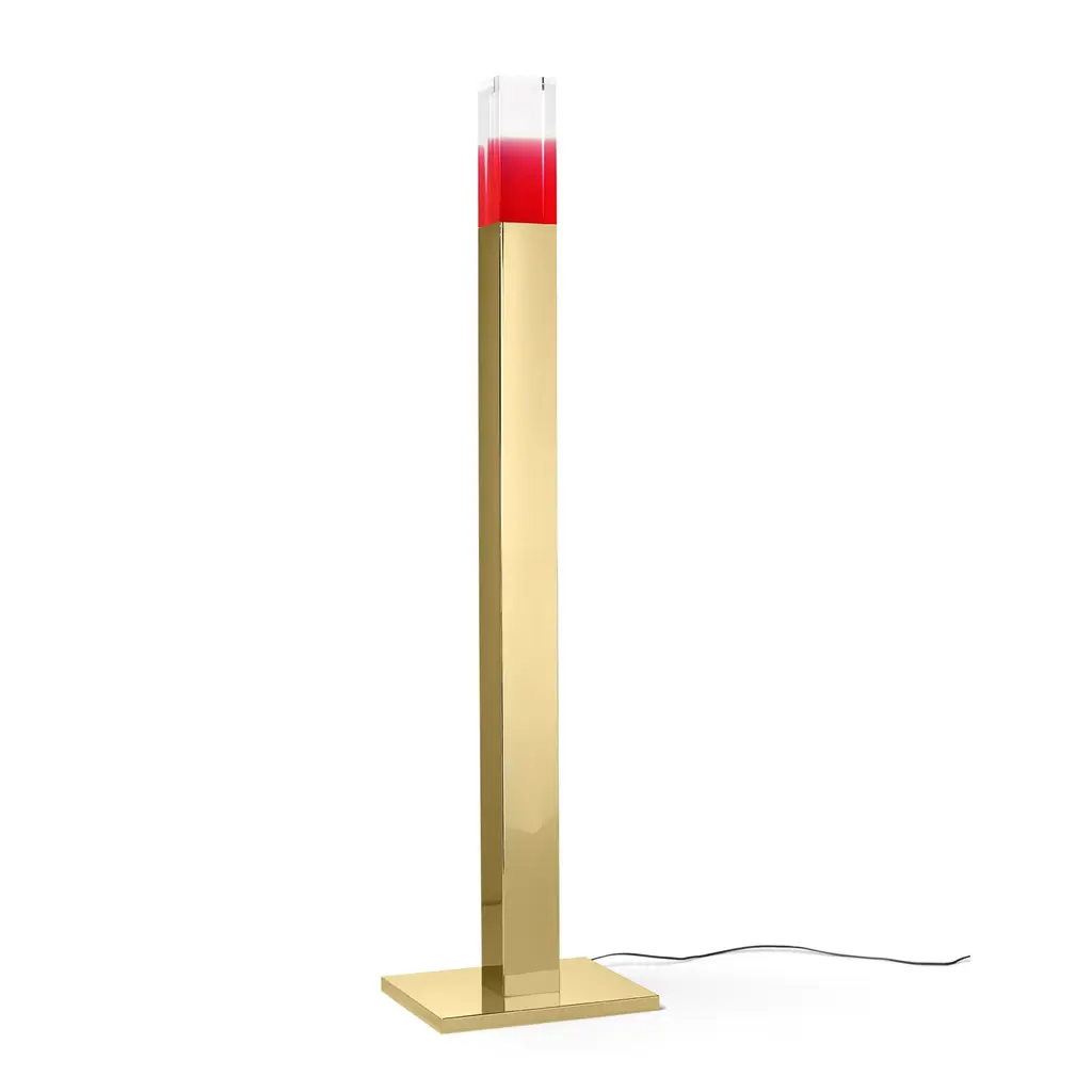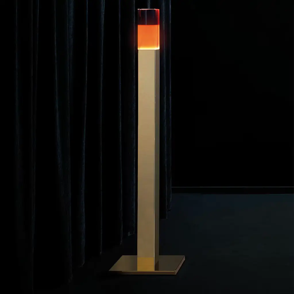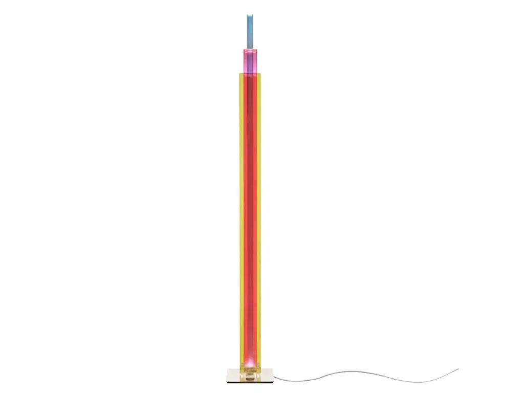 This elegant floor lamp by Andrea Branzi has a body in stainless steel and a top in two-toned plexiglass. The use of straight lines and the rectangle shape in different sizes and configurations gives this lamp a minimalist and contemporary look, vocative of a giant match lit up.