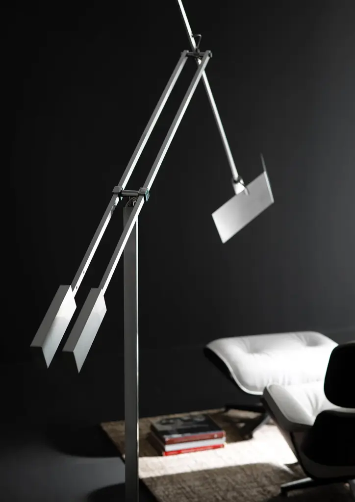 Genius, intuition, balance. Giraffa is an adjustable and extendable aluminum floor lamp with chromed brass details. A system of counterweights makes it possible for the lamp to be placed in endless configurations. A boom microphone used in TV production is what inspired Brotto’s idea for a floor lamp that would become one of the important iconic products of Esperia in the world. Giraffa is linear, elegant, slender, balanced. Now, it is also available in the new LED version and in two new, exclusive finishes, to celebrate Esperia’s 70+1 anniversary. White with black nickel details and matte black with chromed brass details.