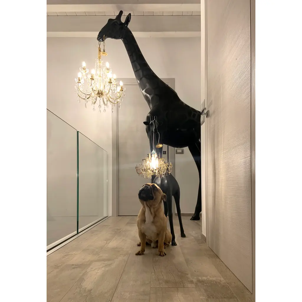 Elevate your home decor with the Giraffe Statue Floor Lamp M by Qeeboo. Designed by Marcantonio, this stunning giraffe lamp stands at 2.65 meters tall and features a classic Marie-Therèse chandelier. With upgraded lighting and added stability, this elegant piece is sure to be the center of attention in any living room. Bring a touch of sophistication and luxury with this exclusive and bold design.