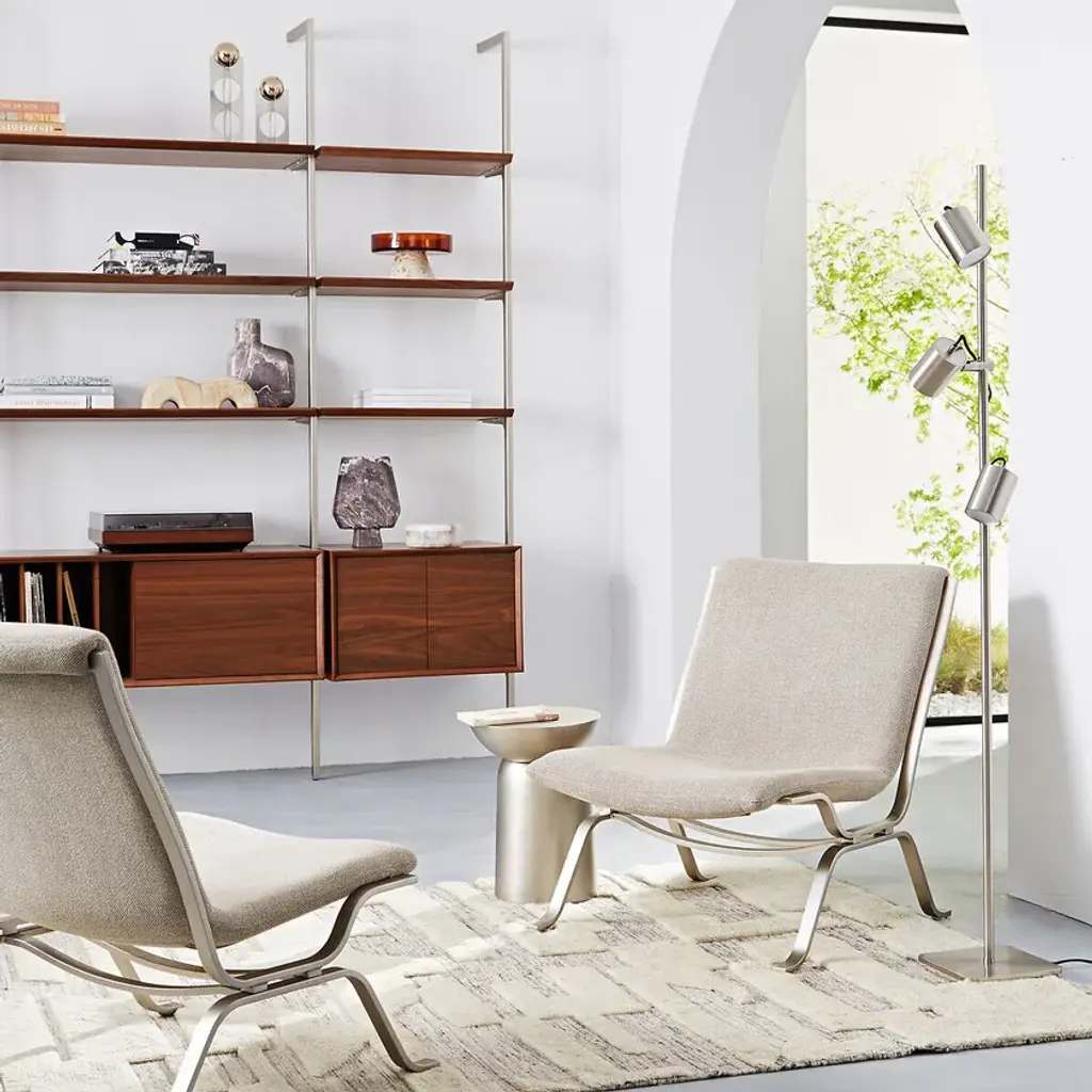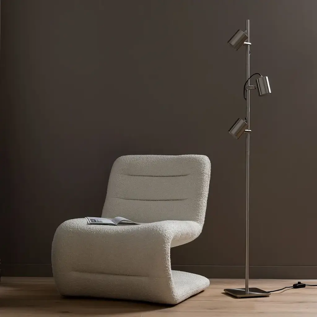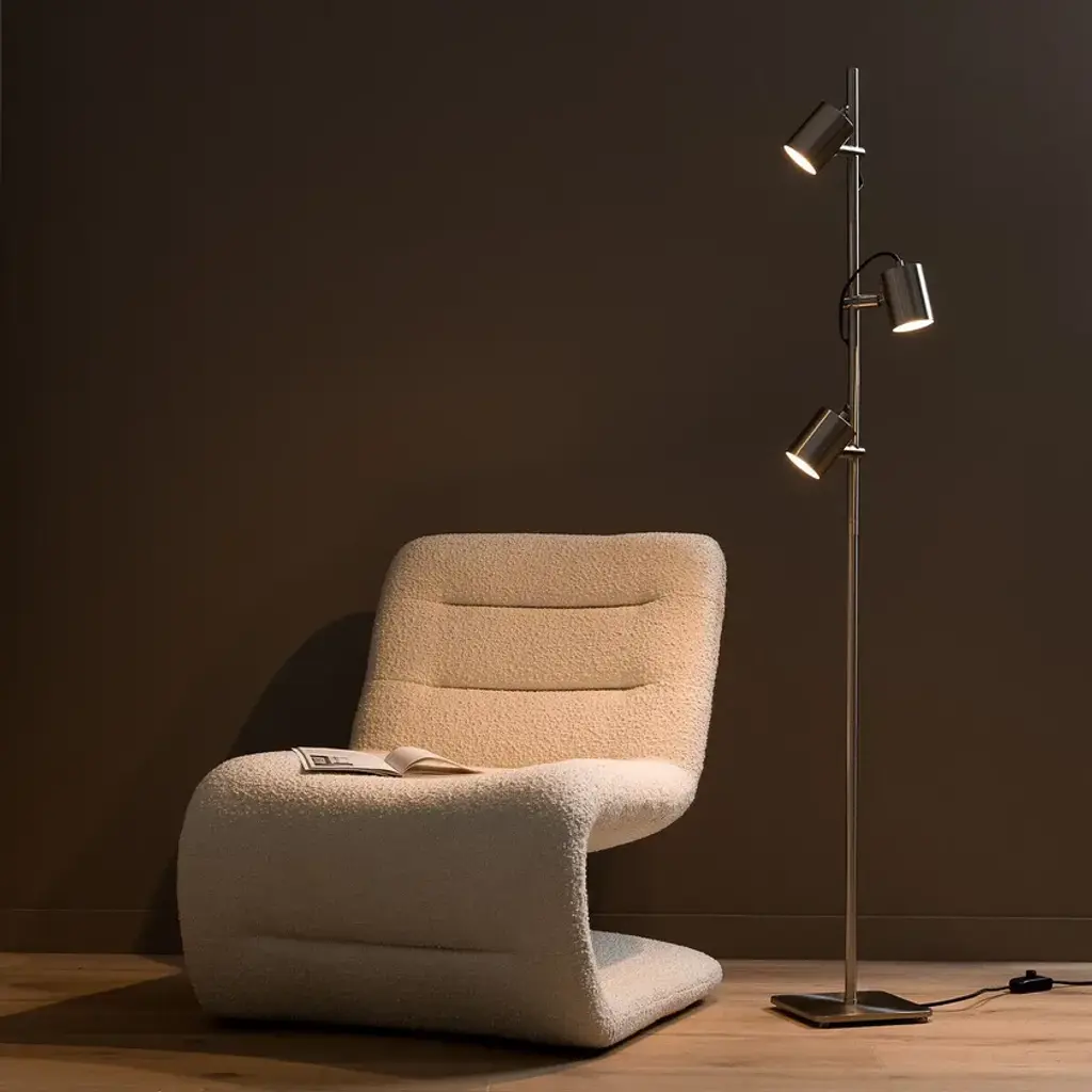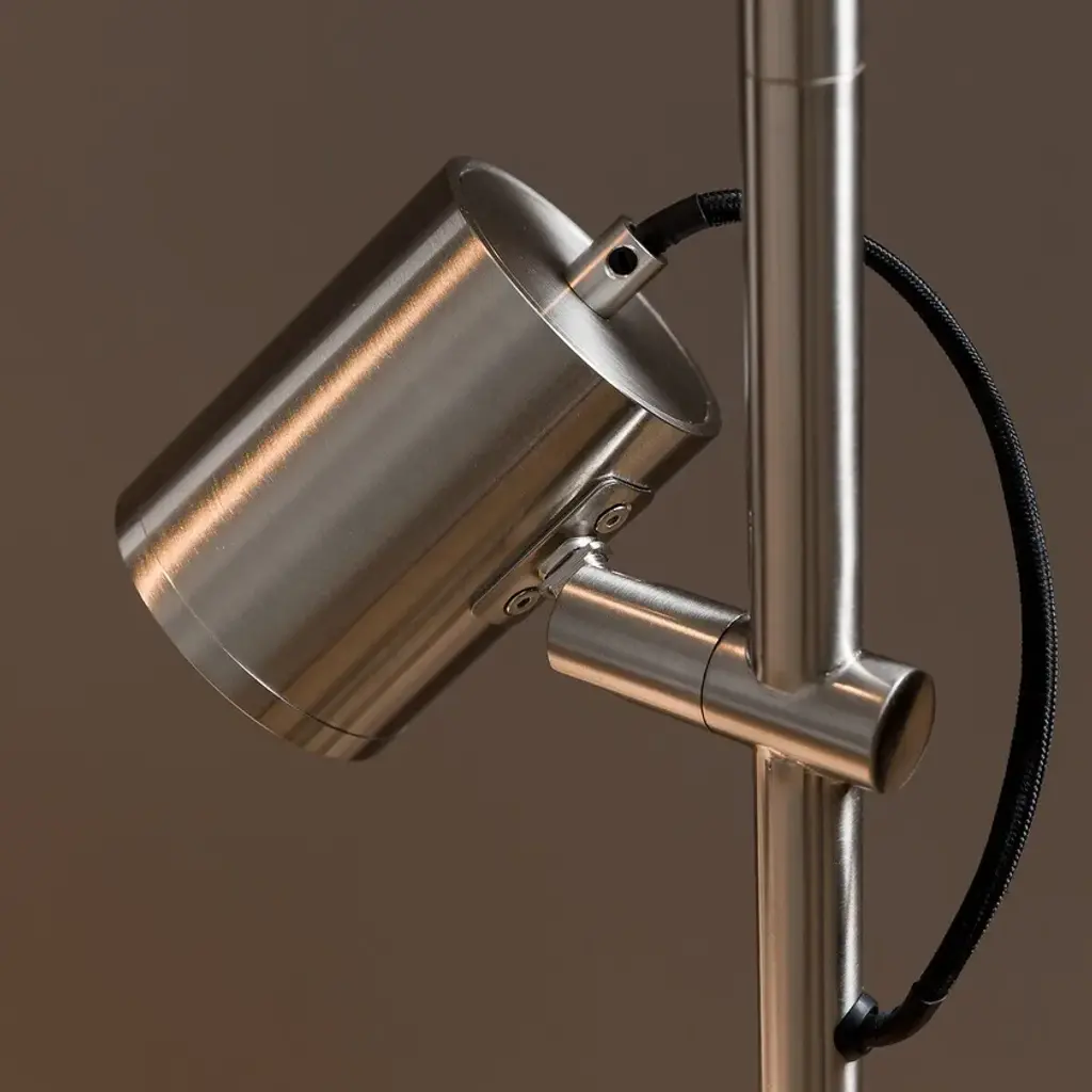 The Girevole floor lamp is characterised by a clean, timeless line inspired by the 1970s. The satin nickel finish emphasises its contemporary side and fits perfectly into any interior. Its 360° swivelling diffusers allow the light to be precisely directed.Made of iron with a satin nickel finishAvailable with 1 or 3 adjustable diffusersElectric cable with polypropylene fabric sheathingDimmable switchHolder for GU10 lamp holderFor bulb (not included): 5W max.