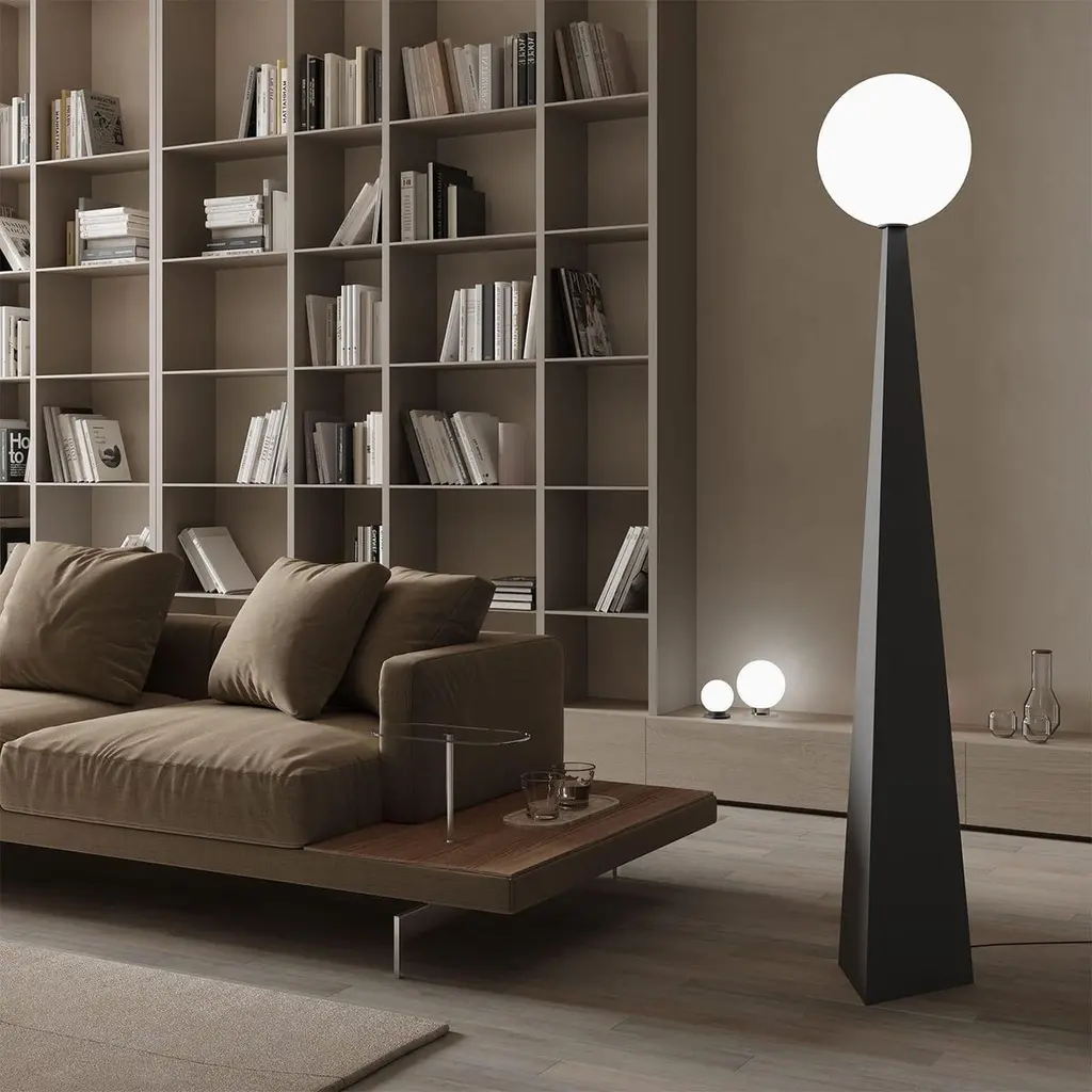 At once rigorous and graceful in its pyramid silhouette of unmistakable geometric inspiration, this floor lamp will ideally suit corners of refined contemporary homes. Craftsmanship and modernity define the piece, offering a charming diffusion of light that radiates unobstructed from within the spherical shade. Dimmable on request.