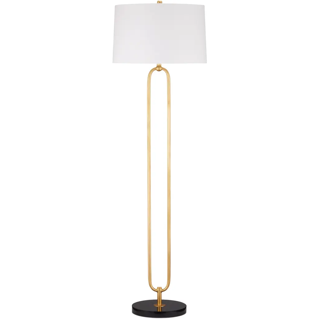 The oblong open-form body of the Glossary Floor Lamp is made of metal in a contemporary gold leaf finish. Clarence Mallari designed the gold floor lamp to look like a giant paper clip that rises above a black marble base. This contemporary design will be a perfect choice for a space needing stylish yet unobtrusive elements. The Glossary is topped with an off-white linen shade.