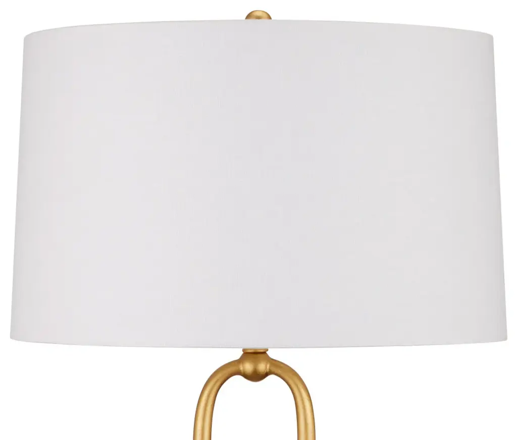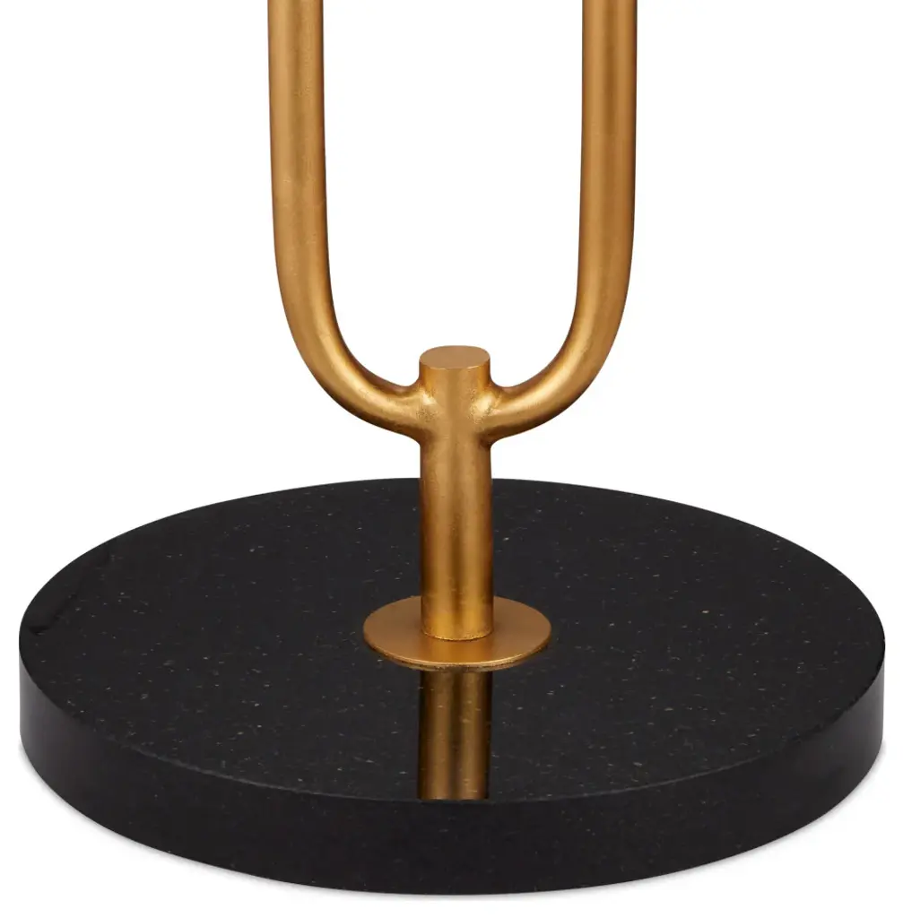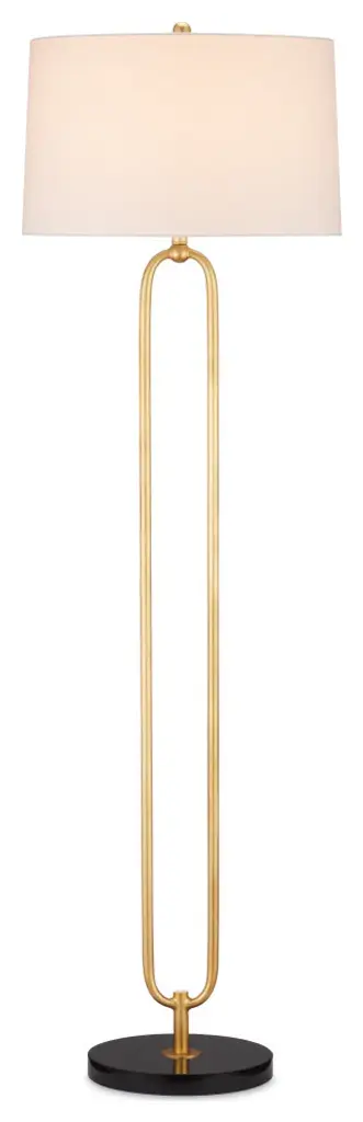 The oblong open-form body of the Glossary Floor Lamp is made of metal in a contemporary gold leaf finish. Clarence Mallari designed the gold floor lamp to look like a giant paper clip that rises above a black marble base. This contemporary design will be a perfect choice for a space needing stylish yet unobtrusive elements. The Glossary is topped with an off-white linen shade.Number of Bulbs: 1Type of Bulb: A StandardMax Bulb Wattage: 150Bulbs Included: Bulb Not Included