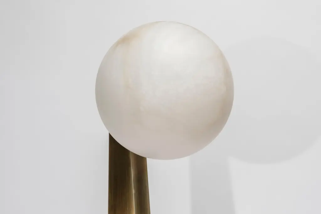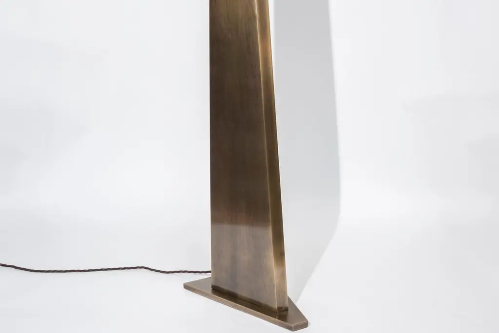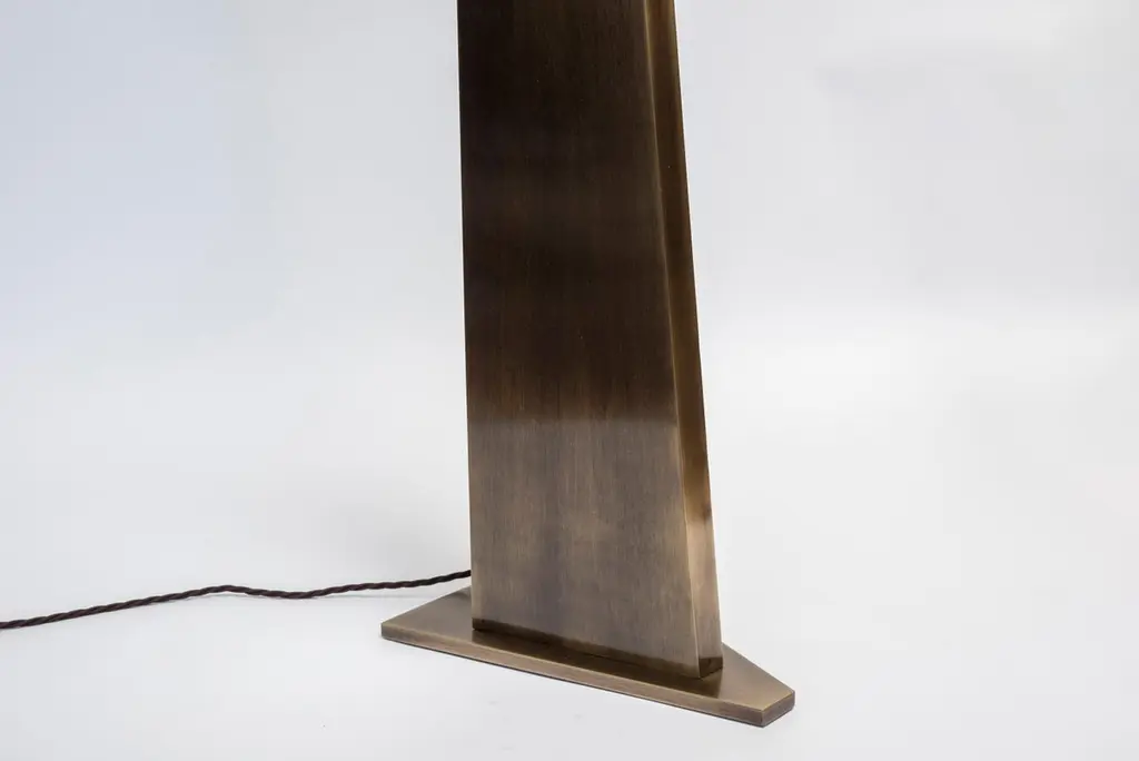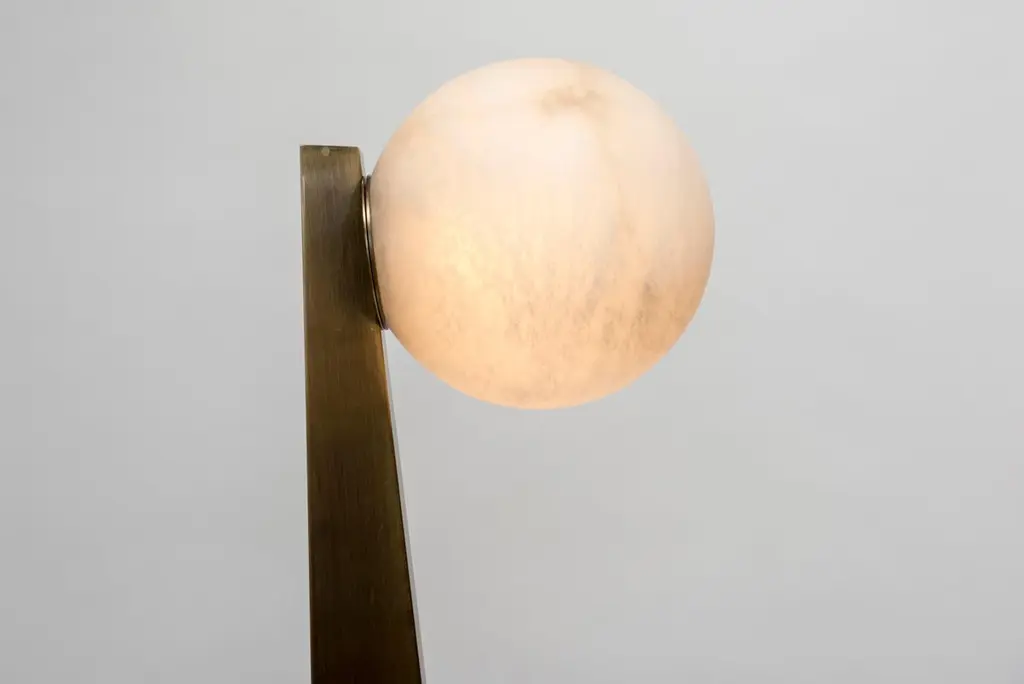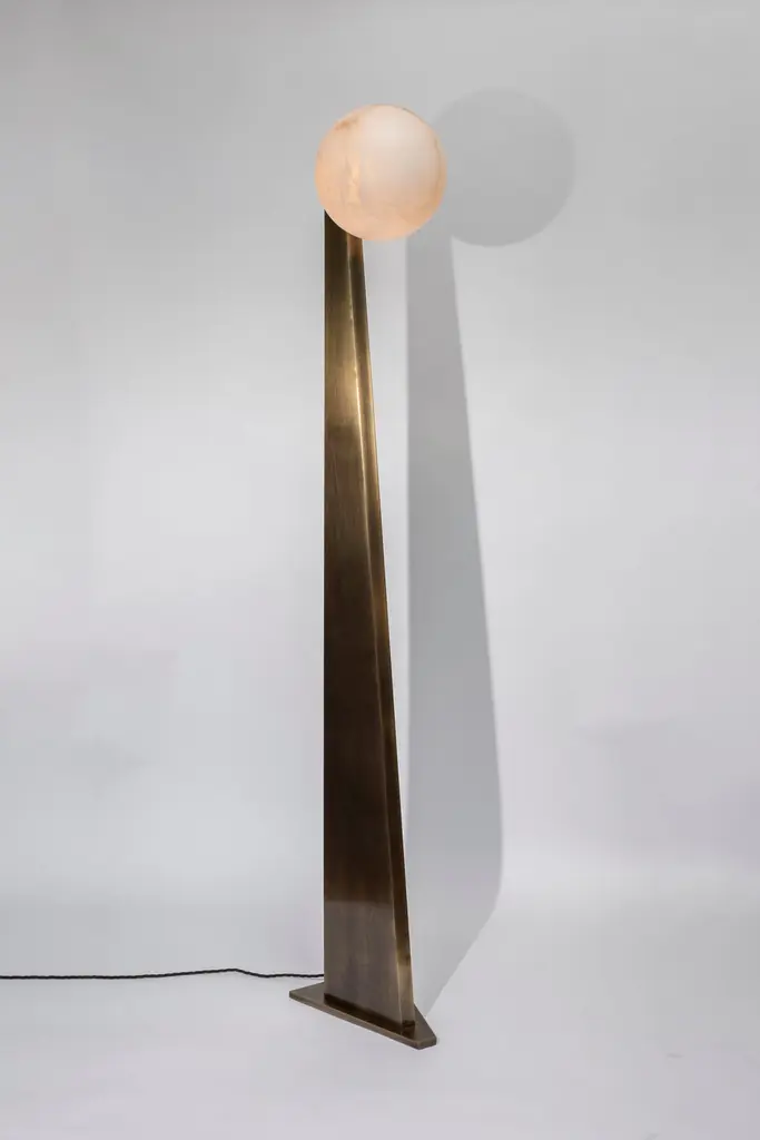 New design by Glustin Luminaires, triangle shaped floor lamp in bronze finish brass with an alabaster globe hosting the light source.