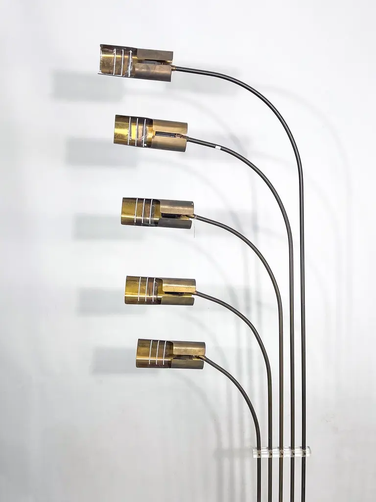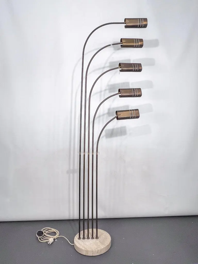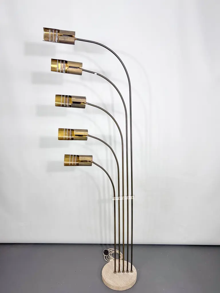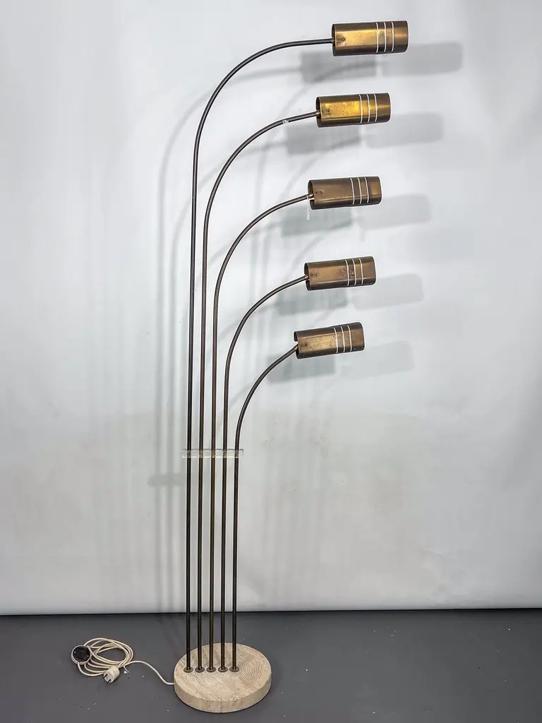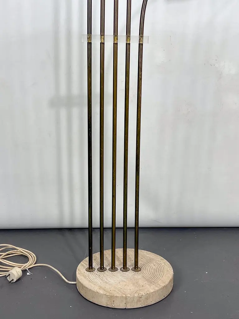 Elegant mid-century floor lamp, probably designed by Goffredo Reggiani. Featuring five arched arms in brass with perforated cylindrical shades, all mounted on a circular da travertine base. A refined example of Italian lighting design from the 1960s, combining sculptural form with high-quality materials. In original vintage condition with evident patina on the brass. The item will be shipped all disassembled. Fully functional with EU standard wiring, easily adaptable to US standards upon request.