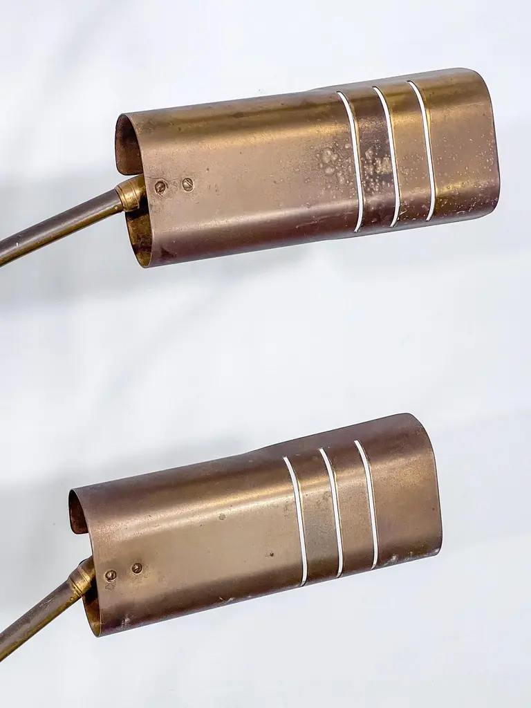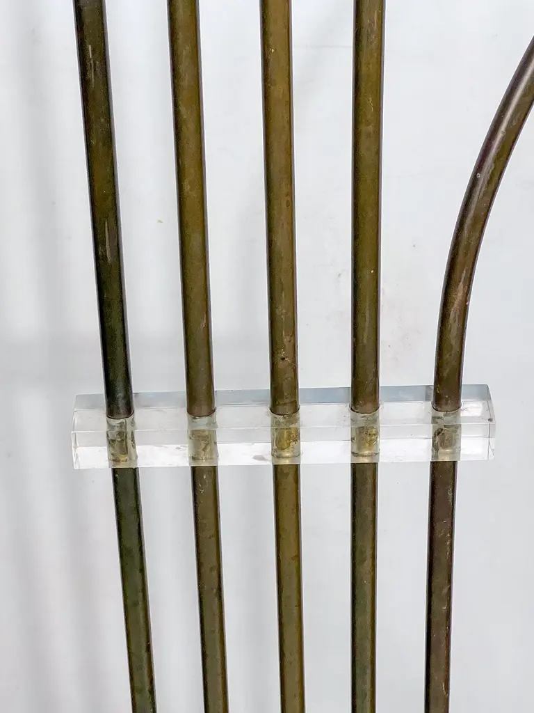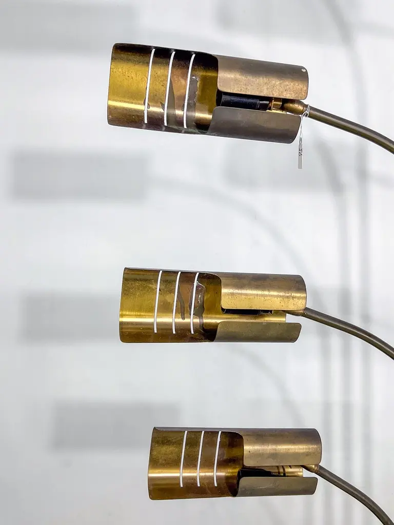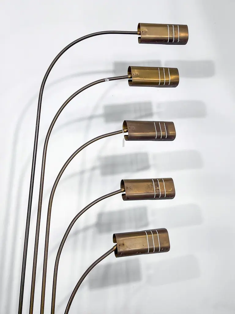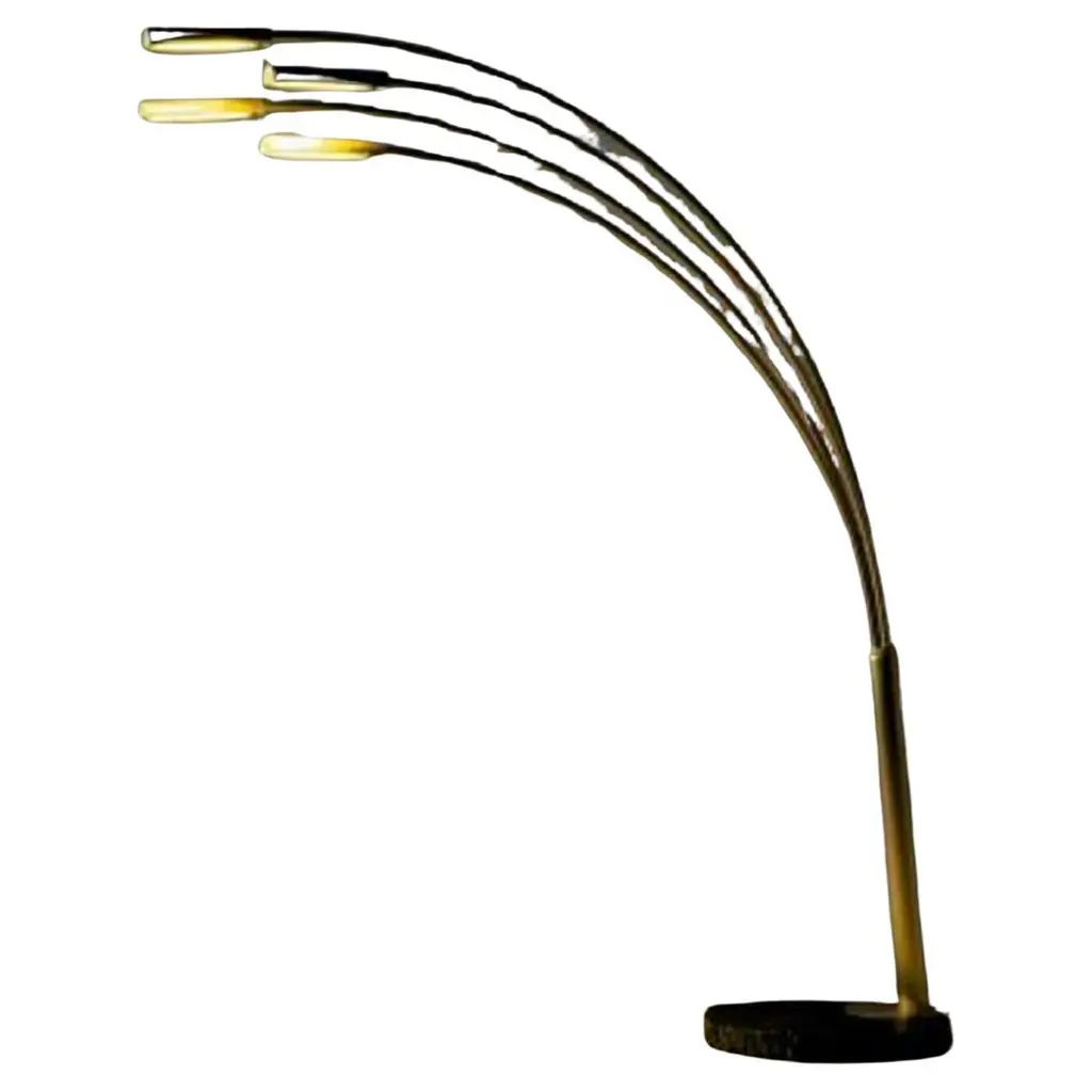 Elegant mid-century floor lamp, probably designed by Goffredo Reggiani. Featuring five arched arms in brass with perforated cylindrical shades, all mounted on a circular da travertine base. A refined example of Italian lighting design from the 1960s, combining sculptural form with high-quality materials. In original vintage condition with evident patina on the brass. The item will be shipped all disassembled. Fully functional with EU standard wiring, easily adaptable to US standards upon request.