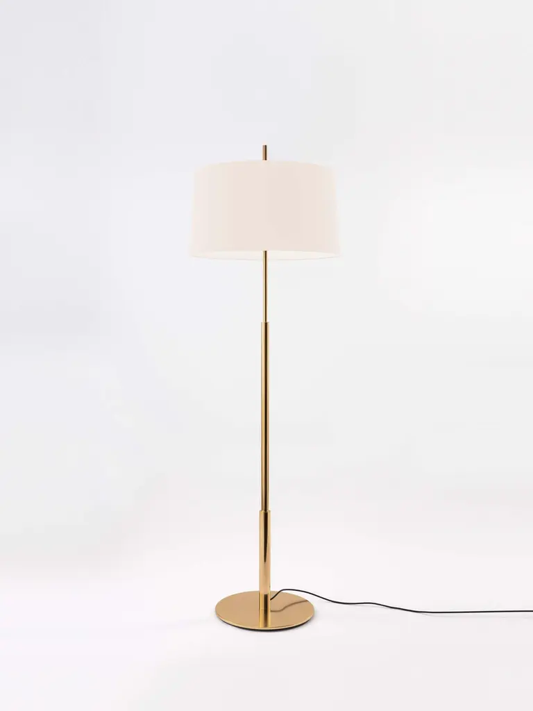 Gold Diana floor lamp by Federico Correa, Alfonso Milá, Miguel MiláDimensions: D 58 x H 183 cmMaterials: Metal, linen.Available in nickel or gold and in black or white shade.In keeping with the calling of its creators, the Diana lamp has a timeless quality. Its metal structure and linen shade are in perfect harmony. Designed to illuminate the Mayor of Barcelona's new offices in the run-up to the 1992 Olympics, its appearance evokes a balance between classic tradition and modernity wherever it is placed.Dimmer included.Santa & Cole is a small, independent and global editor of design products, with its roots in Belloch (Barcelona, Spain). We have been editing since 1985, when the company was first founded. By editing we mean preparing a work for the public domain, we mean adapting an item for everyone’s use. What a book editor does with stories, we do with objects.More than eighty creators have contributed to a rich catalogue of furniture and lighting products originating in very different contexts, by renowned designers such as Antoni Arola, Miguel Milá, André Ricard and llmari Tapiovaara.Acute and attentive to quality and detail, Santa & Cole outsources all of its industrial production to an extensive network of suppliers, mainly in Spain, but also in other countries such as Japan, where the washi paper for our Tekiò lamp is made.Our mission is to build, safeguard and disseminate knowledge through design objects. Objects whose quality is recognisable at the touch of a hand, and that enrich people’s lives, whether at home or in shared environments. Our philosophy is more modern than futurist and we are more intrigued by silence than by stridency.Our focus is not the present market, but the future one; not Barcelona, but the world; not fashion, but history.All our lamps can be wired according to each country. If sold to the USA it will be wired for the USA for instance.