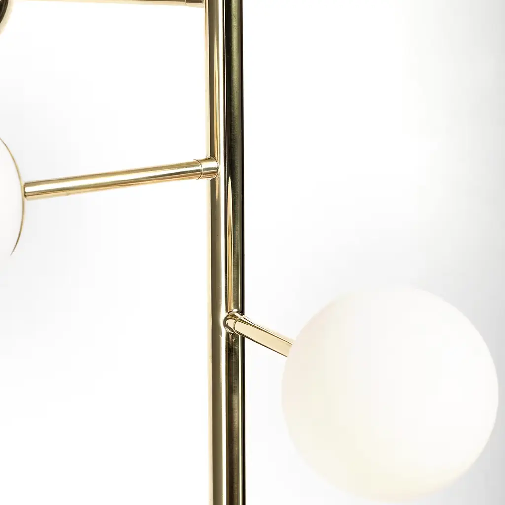 An elegant piece of minimalist sophistication, this floor lamp will be the focal point in any contemporary decor. Crafted of burnished brass, it features a circular base on which stands a long stem holding five horizontal arms, each showcasing a white opaque glass spherical shade, arranged in a spiral silhouette.