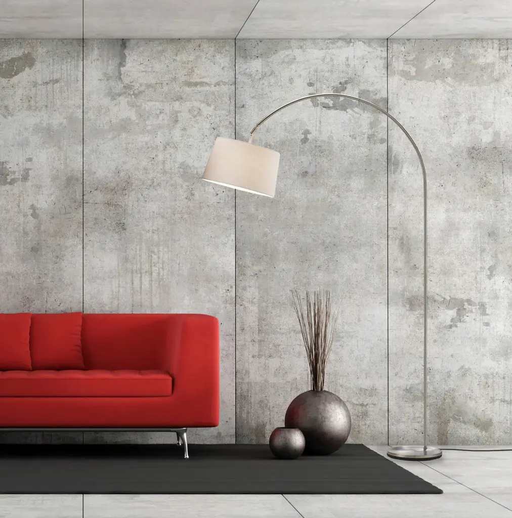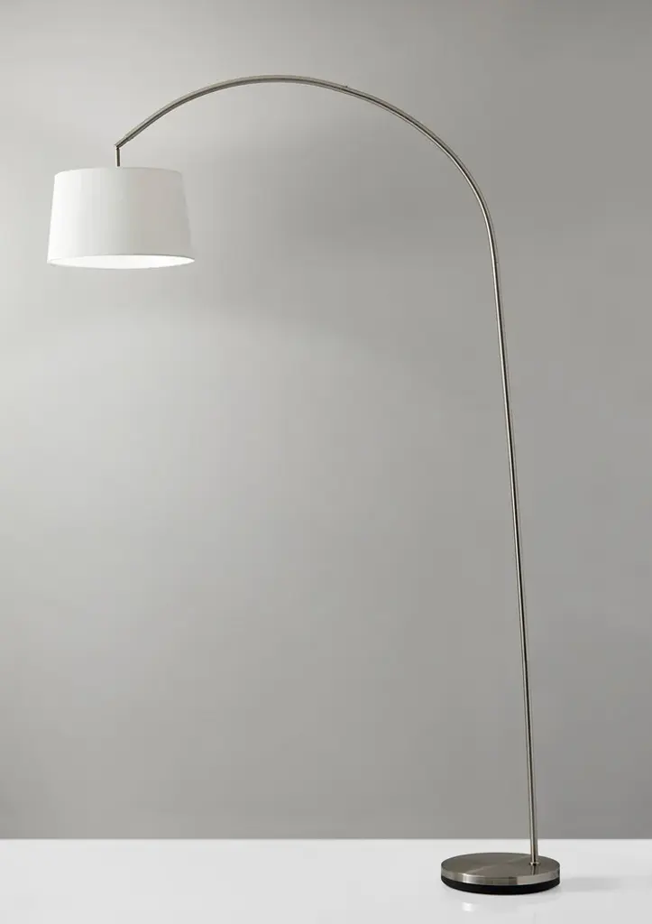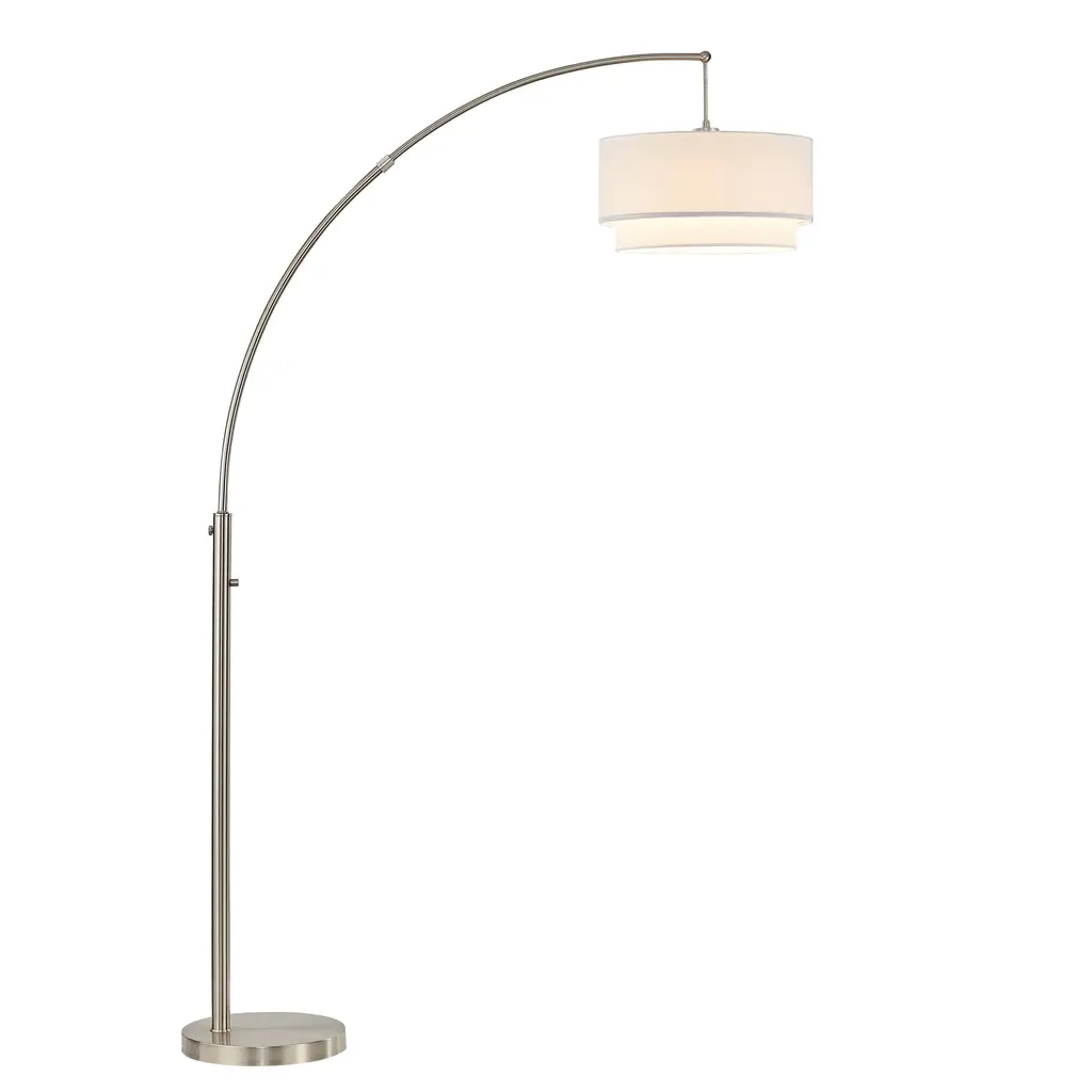 The Goliath is a sweeping arc lamp with a heavily weighted base in satin steel with a natural linen shade, which adjusts vertically On-off foot-step switch 150-watt incandescent or equivalent CFL bulb 83" height, 53.5" to 60" depth, 12.5" diameter base, 61.5" from floor to shade bottom Shade: 9" height, 15" bottom diameter, 13.25" top diameter Bulbs not included