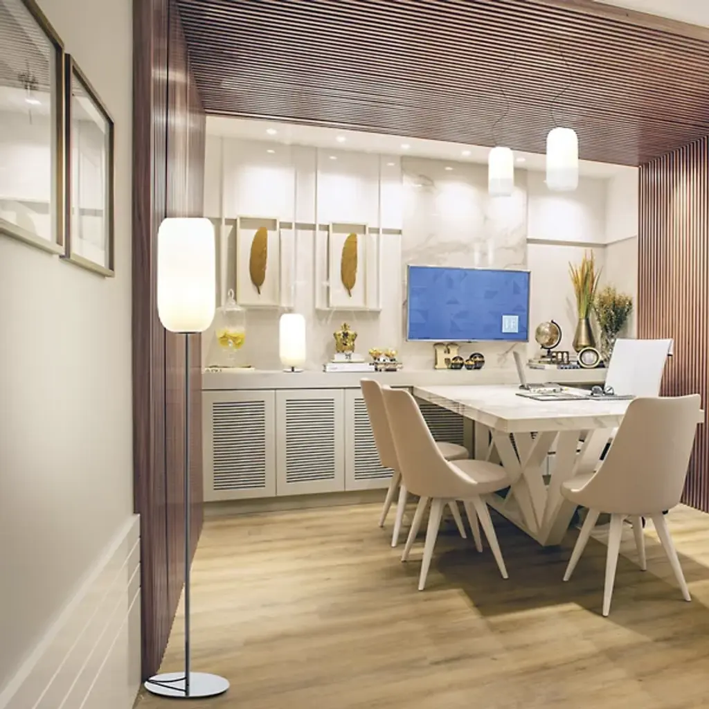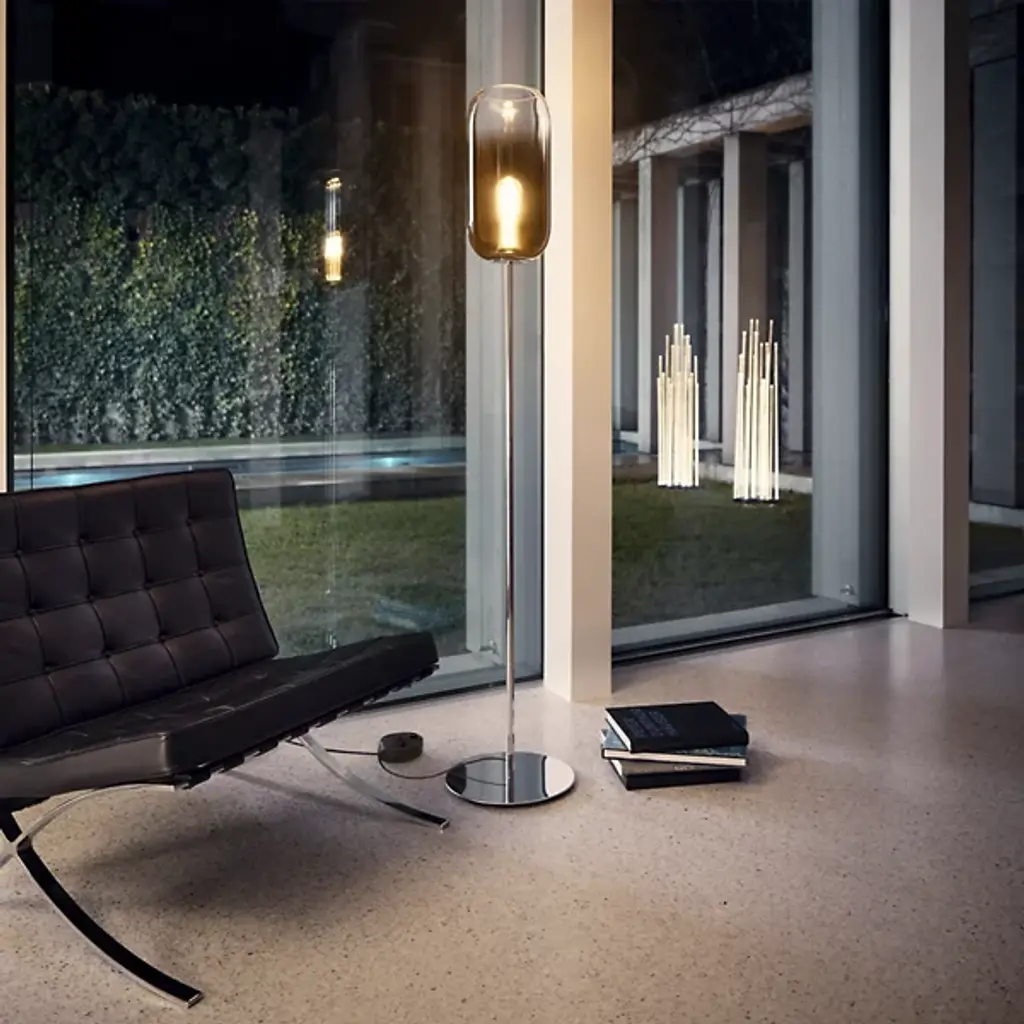 A piece that captivates a room with an ethereal ambiance. The Gople Floor Lamp by Artemide is a design by Bjarke Ingels Group with a stunning pill-shaped shade handblown with traditional Venetian Murano glass. A smooth circular base offers a polished accent, supporting a slender steel body that raises its shade over 5 feet. An LED bulb brings the piece to life as it accentuates the gradient effect of its uniquely handcrafted shade.