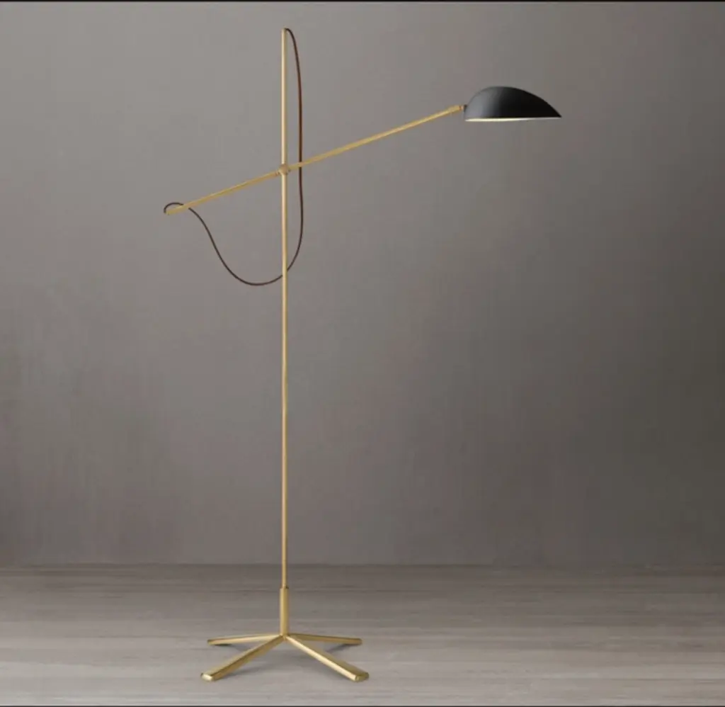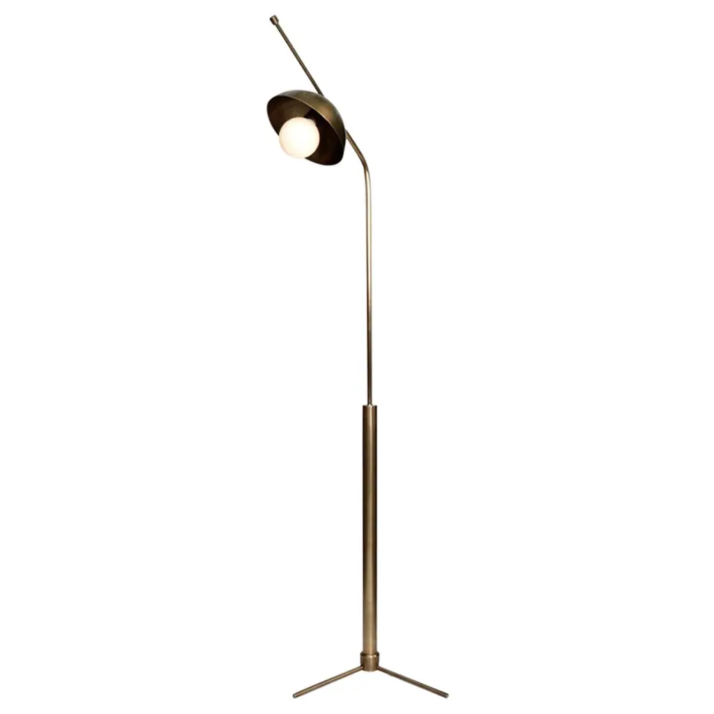 Designer Aerin Lauder of New York redefines modern grandeur with Graphic, featuring a dramatic cup shade on a minimalist frame crafted of powdercoated steel in a hand-rubbed antique brass finish. A rotating boom arm extends from the sculptural, slender base, directing a focused swath of light wherever it's needed.