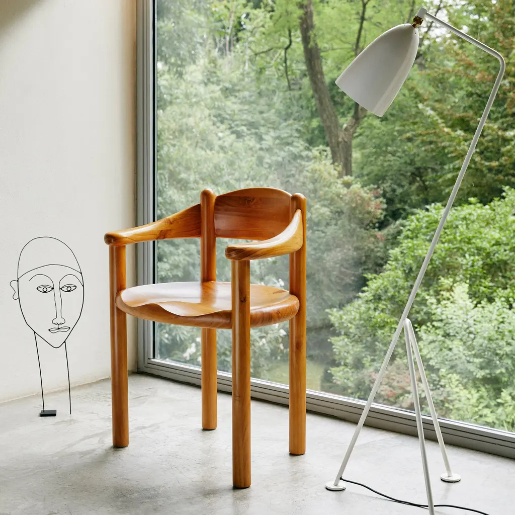 Though little-known today, modernist pioneer Greta M. Grossman first introduced the iconic Gräshoppa Floor Lamp in 1947. With its characteristic backward tilt on a tripod stand, the lamp recalls the stalking stance of its namesake. The elongated conical shade can be tilted and rotated 360 degrees to direct light where it's needed. Powder-coated steel frame and shade in a spectrum of crisp hues.