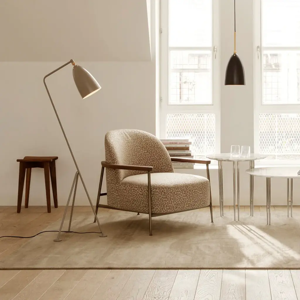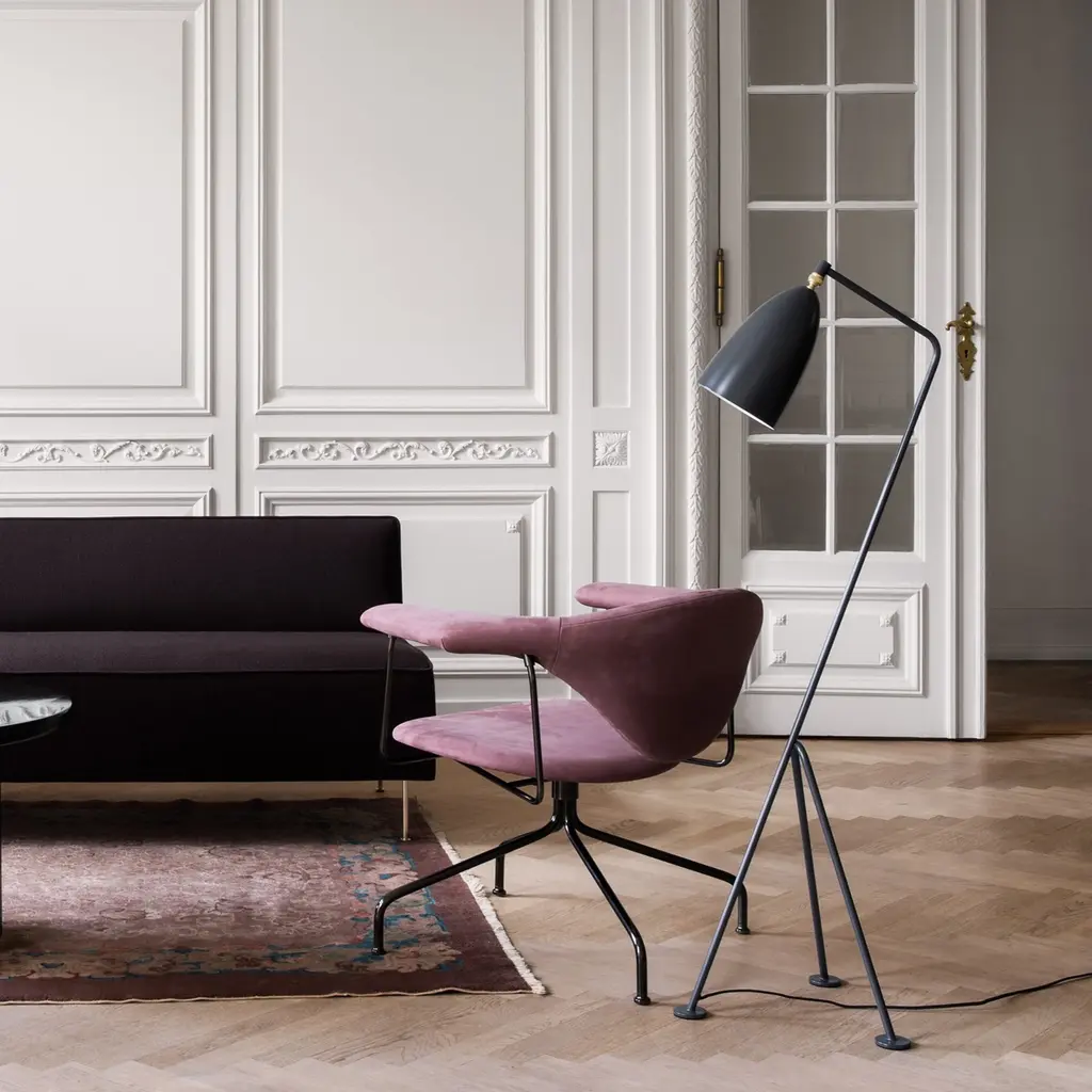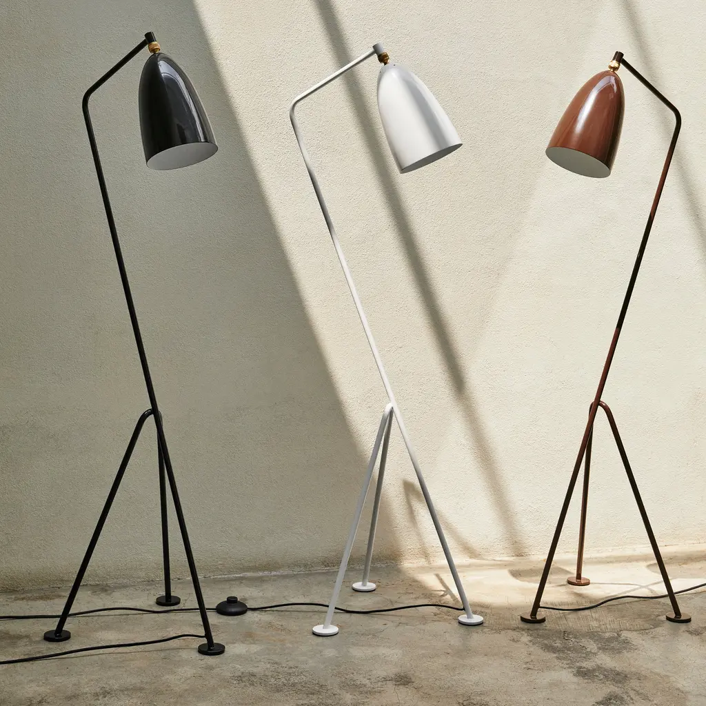 Though little-known today, modernist pioneer Greta M. Grossman first introduced the iconic Gräshoppa Floor Lamp in 1947. With its characteristic backward tilt on a tripod stand, the lamp recalls the stalking stance of its namesake. The elongated conical shade can be tilted and rotated 360 degrees to direct light where it's needed. Powder-coated steel frame and shade in a spectrum of crisp hues.