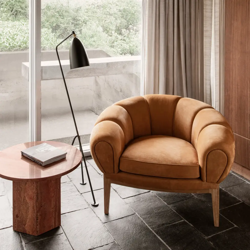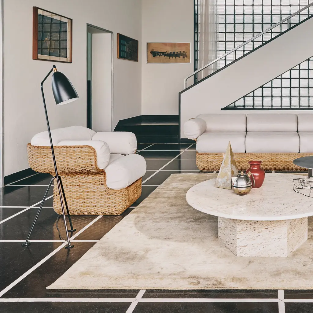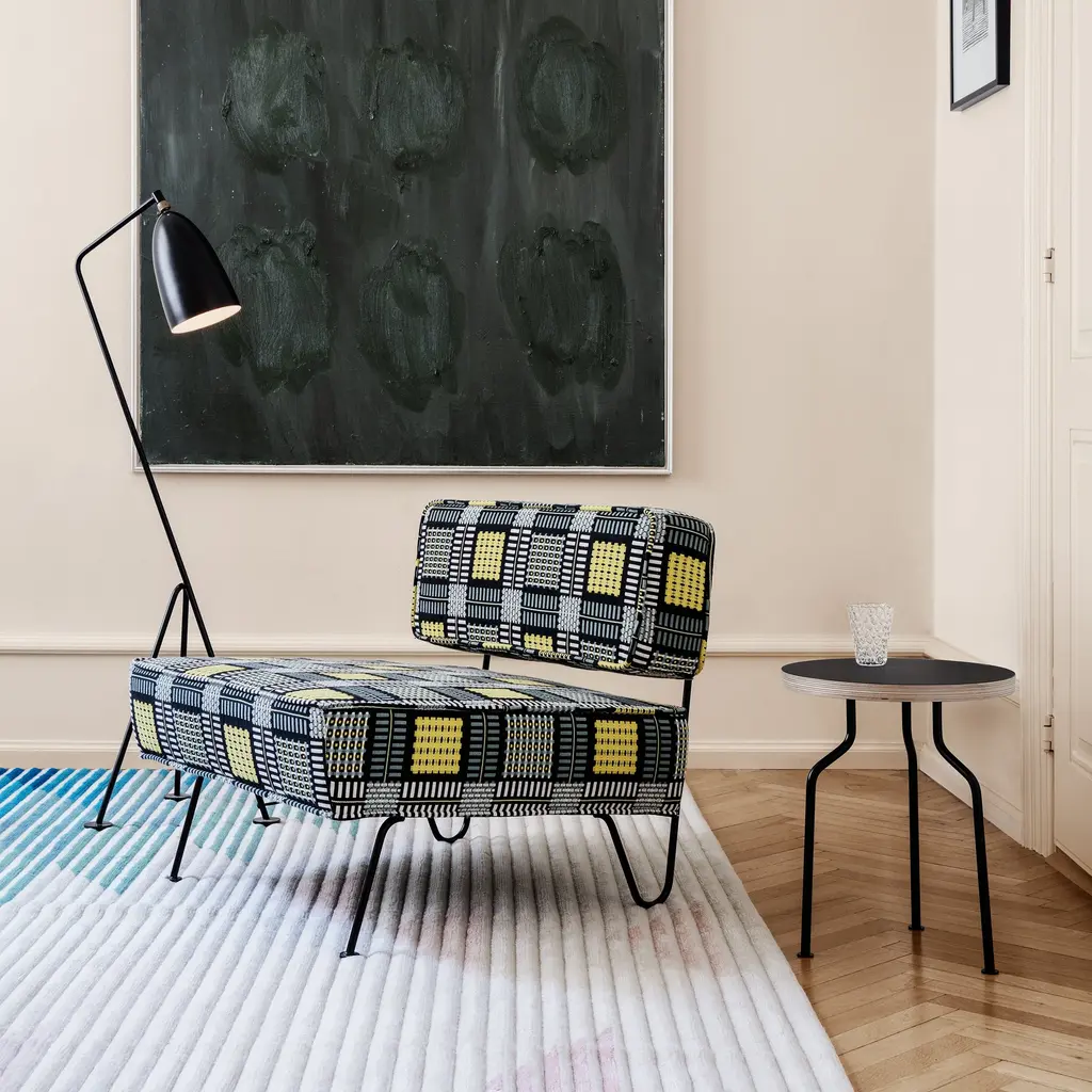 Though little-known today, modernist pioneer Greta M. Grossman first introduced the iconic Gräshoppa Floor Lamp in 1947. With its characteristic backward tilt on a tripod stand, the lamp recalls the stalking stance of its namesake. The elongated conical shade can be tilted and rotated 360 degrees to direct light where it's needed. Powder-coated steel frame and shade in a spectrum of crisp hues.
