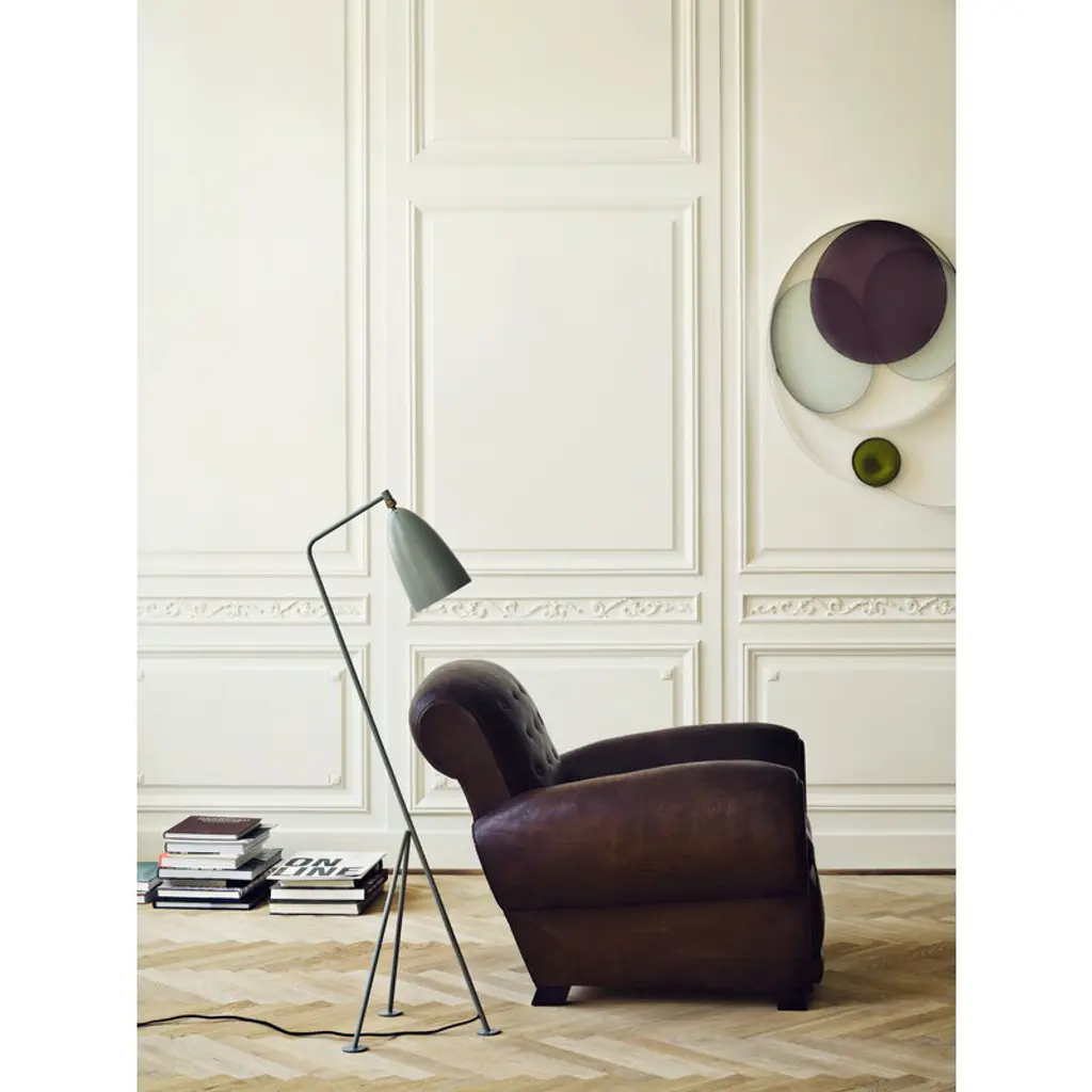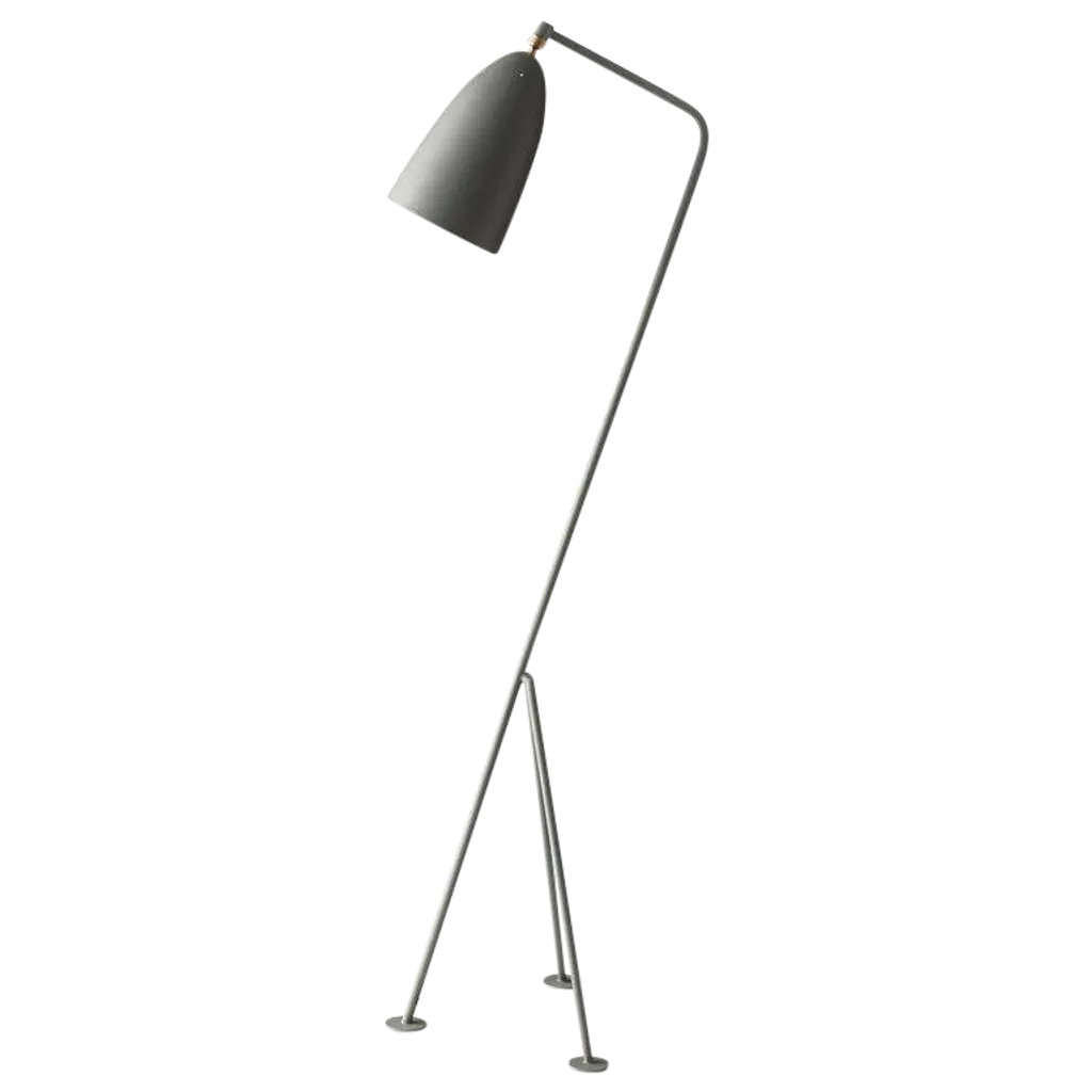 GUBI's iconic Gräshoppa floor lamp, designed by Greta Magnusson, was first introduced in 1947 and reissued in 2011. The signature form features a simple bell-like shade and a tilted tripod base with three legs. The shade is mounted onto the arm with a ball joint so the direction of the light is easy to adjust. Both the stand and shade of the Gräshoppa lamp are made of powder-coated steel.