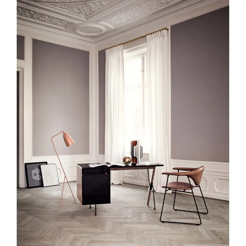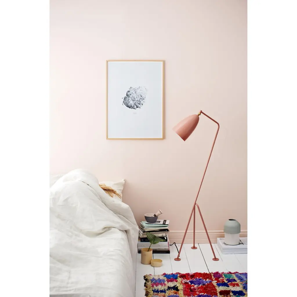 GUBI's iconic Gräshoppa floor lamp, designed by Greta Magnusson, was first introduced in 1947 and reissued in 2011. The signature form features a simple bell-like shade and a tilted tripod base with three legs. The shade is mounted onto the arm with a ball-joint so the direction of the light is easy to adjust. Both the stand and shade of the Gräshoppa lamp are made of powder-coated steel.