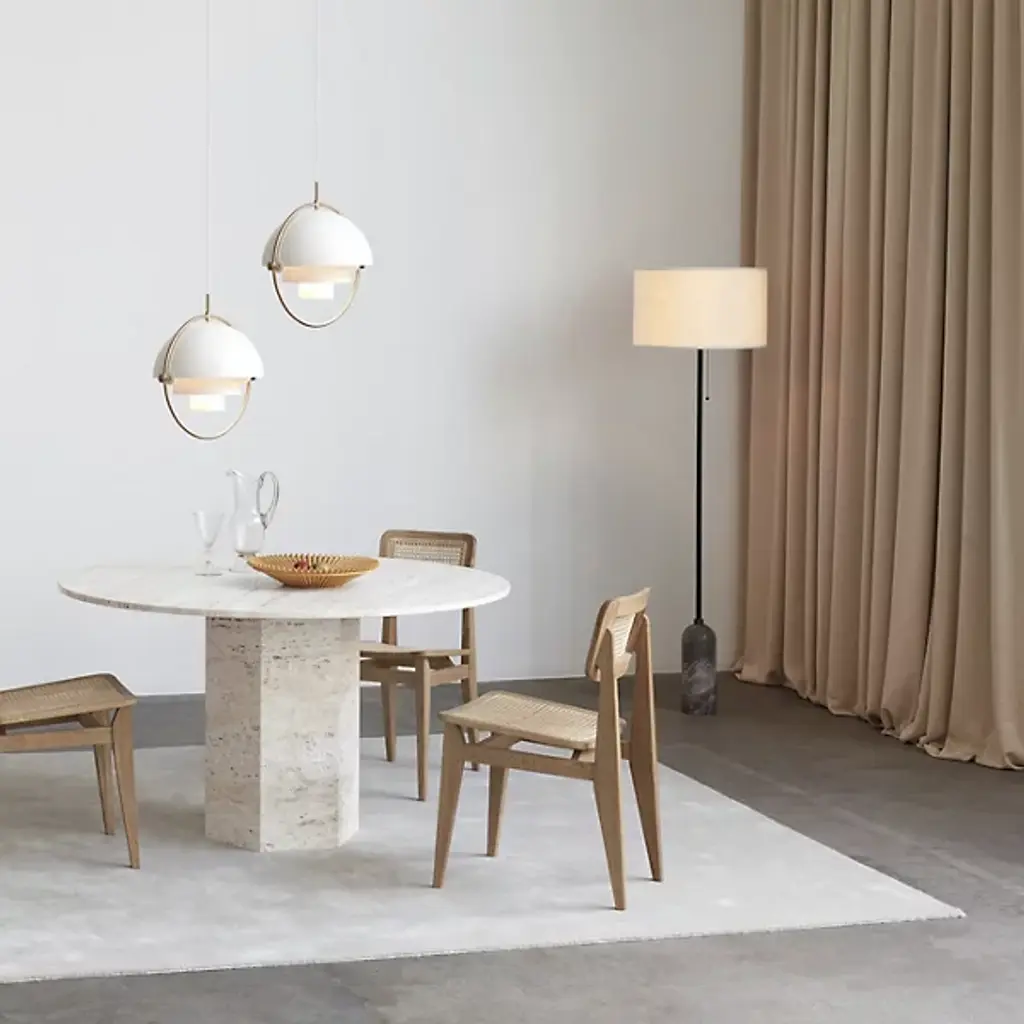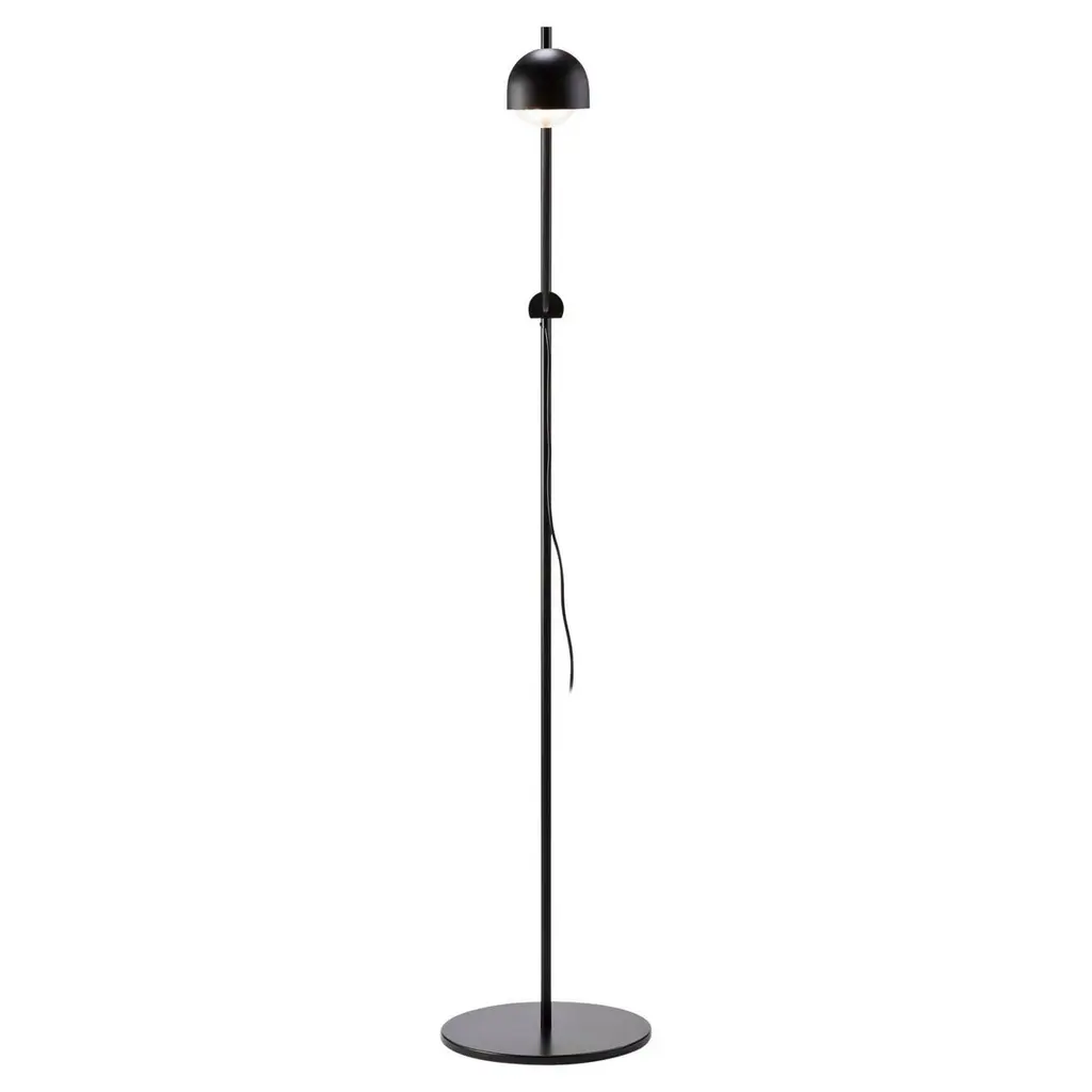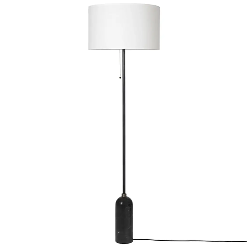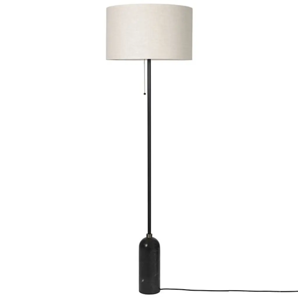 A study in contrasting strength and fragility. Add a sleek embellishment to your indoor living spaces with the Gravity Floor Lamp from GUBI. A daring design from SpaceCopenhagen, a firm founded by Signe Bindslev Henriksen and Peter Bundgaard Rützou, it follows their philosophy of promoting curiosity through the balancing of opposite elements. The fixture starts with a heavy cylindrical base and rounded top that anchor a long, slender stem that travels up to switched, single-socket lamping under an ethereal shade, lightening in both mass and ambient brightness as it rises while nonetheless staying stable. It gets its name from the contrast of the sturdy base and airy shade.