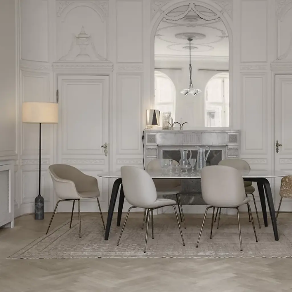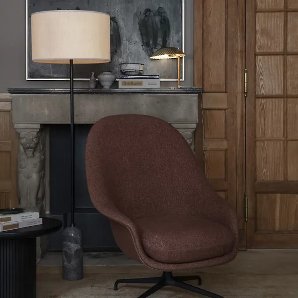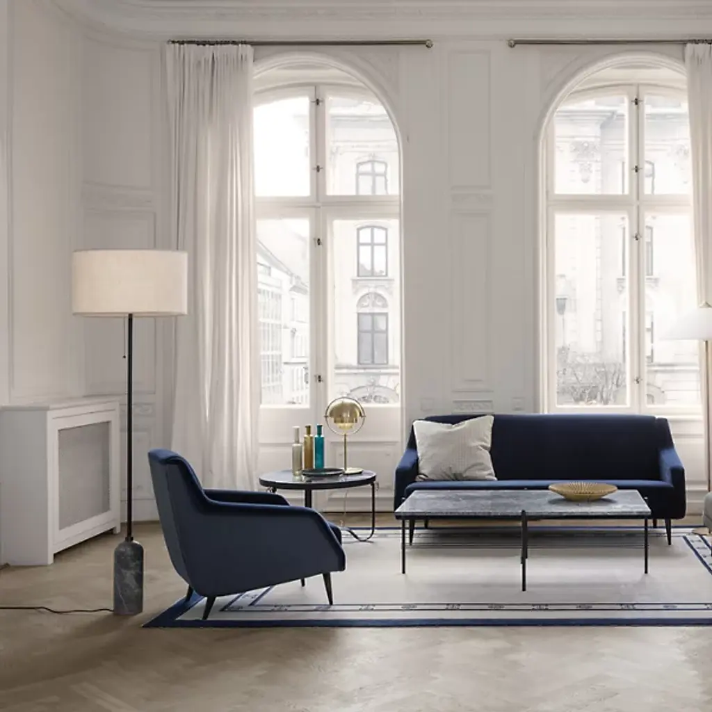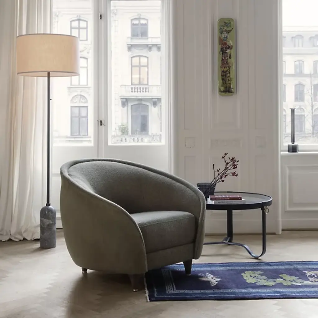 A study in contrasting strength and fragility. Add a sleek embellishment to your indoor living spaces with the Gravity Floor Lamp from GUBI. A daring design from SpaceCopenhagen, a firm founded by Signe Bindslev Henriksen and Peter Bundgaard Rützou, it follows their philosophy of promoting curiosity through the balancing of opposite elements. The fixture starts with a heavy cylindrical base and rounded top that anchor a long, slender stem that travels up to switched, single-socket lamping under an ethereal shade, lightening in both mass and ambient brightness as it rises while nonetheless staying stable. It gets its name from the contrast of the sturdy base and airy shade.