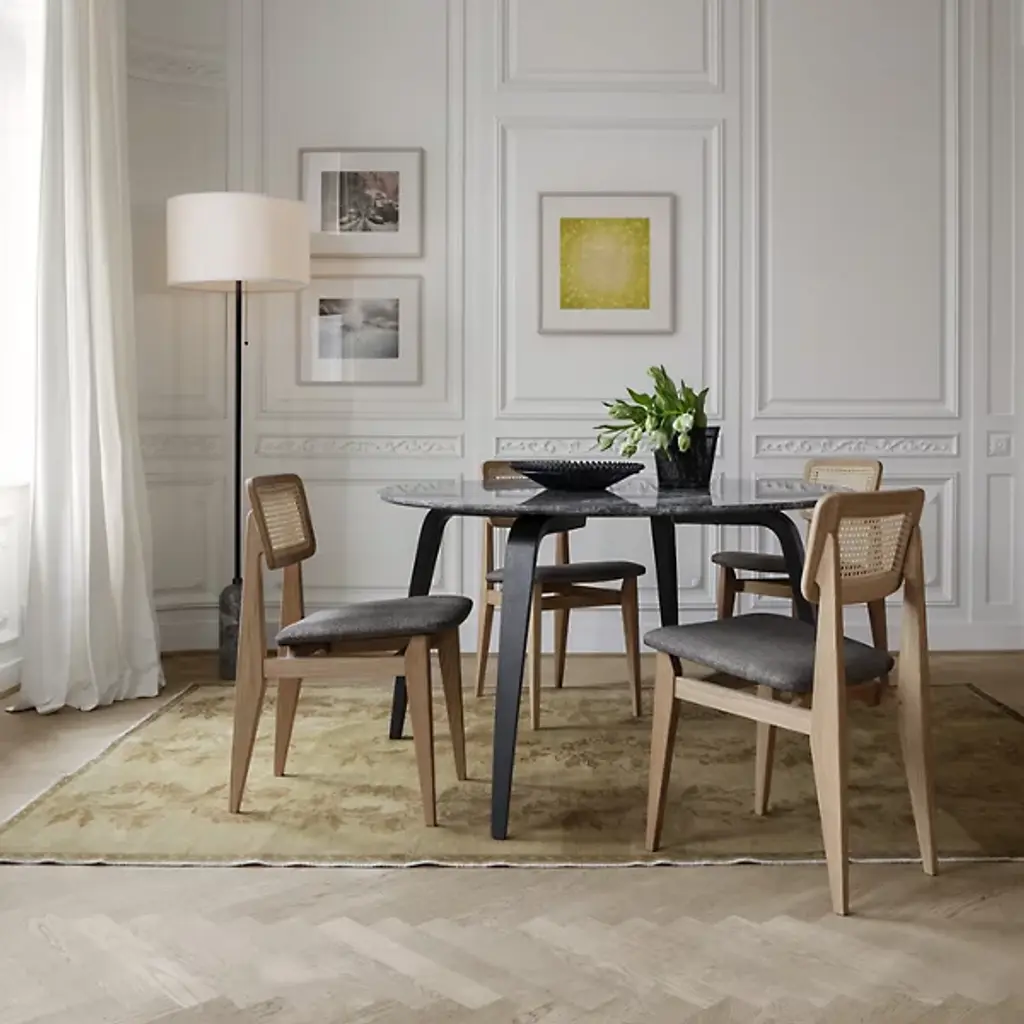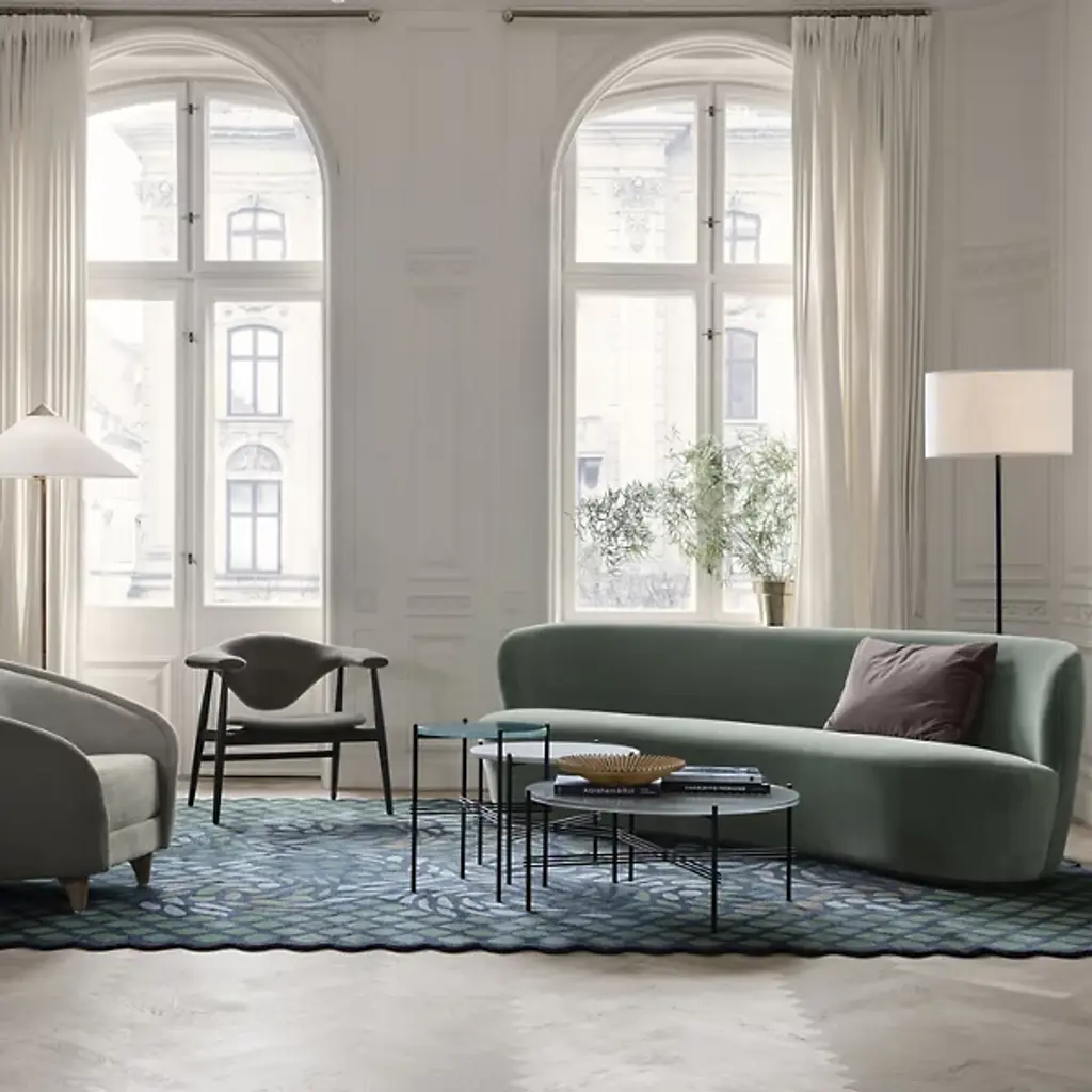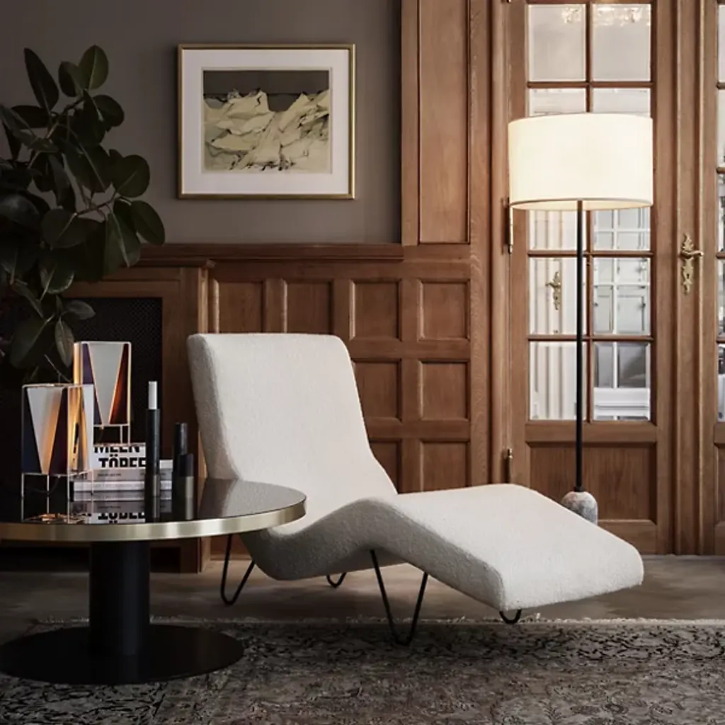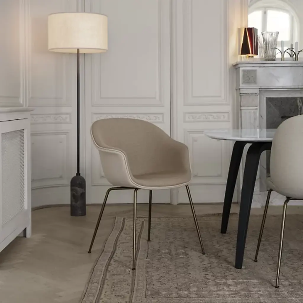 A study in contrasting strength and fragility. Add a sleek embellishment to your indoor living spaces with the Gravity Floor Lamp from GUBI. A daring design from SpaceCopenhagen, a firm founded by Signe Bindslev Henriksen and Peter Bundgaard Rützou, it follows their philosophy of promoting curiosity through the balancing of opposite elements. The fixture starts with a heavy cylindrical base and rounded top that anchor a long, slender stem that travels up to switched, single-socket lamping under an ethereal shade, lightening in both mass and ambient brightness as it rises while nonetheless staying stable. It gets its name from the contrast of the sturdy base and airy shade.
