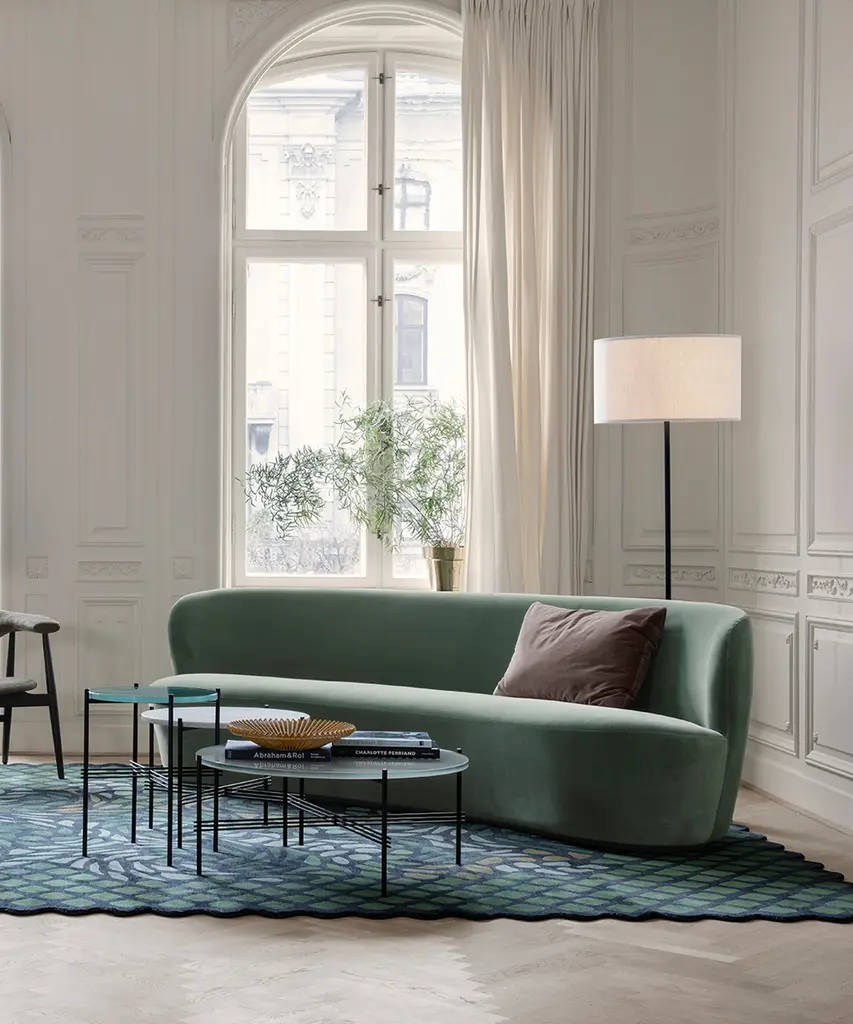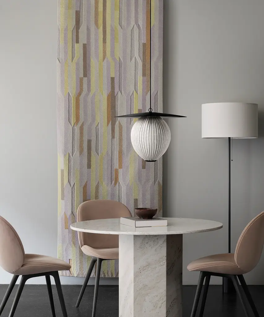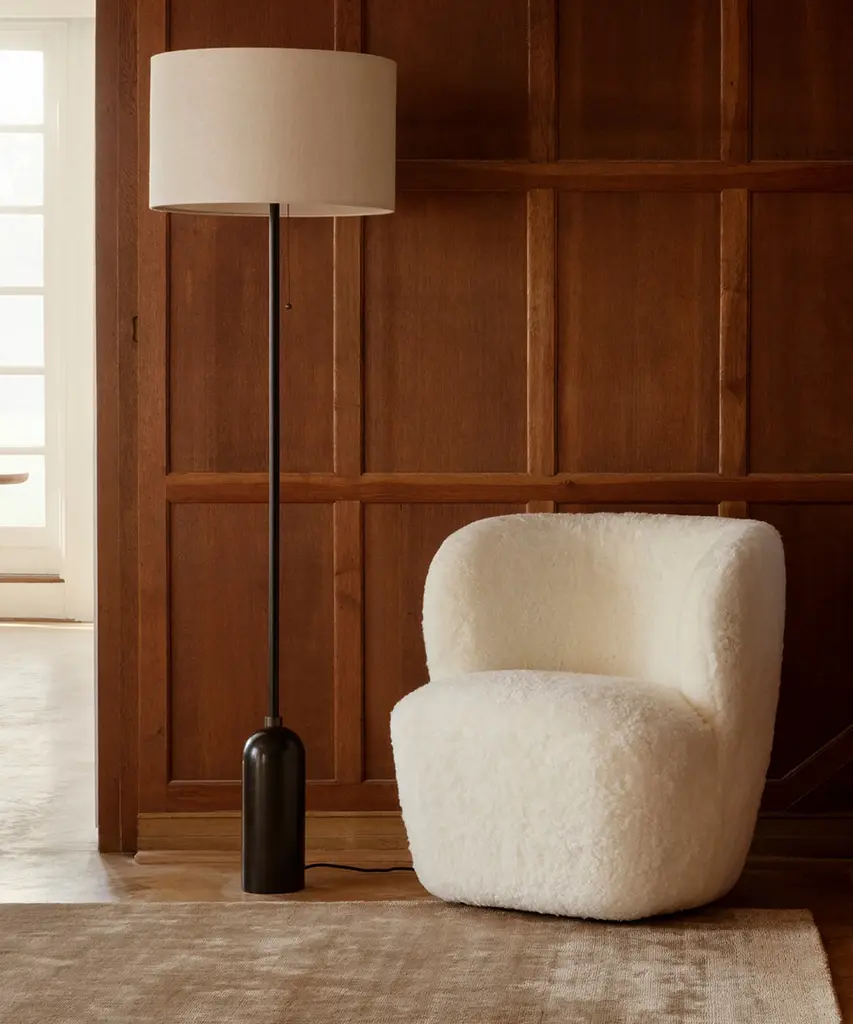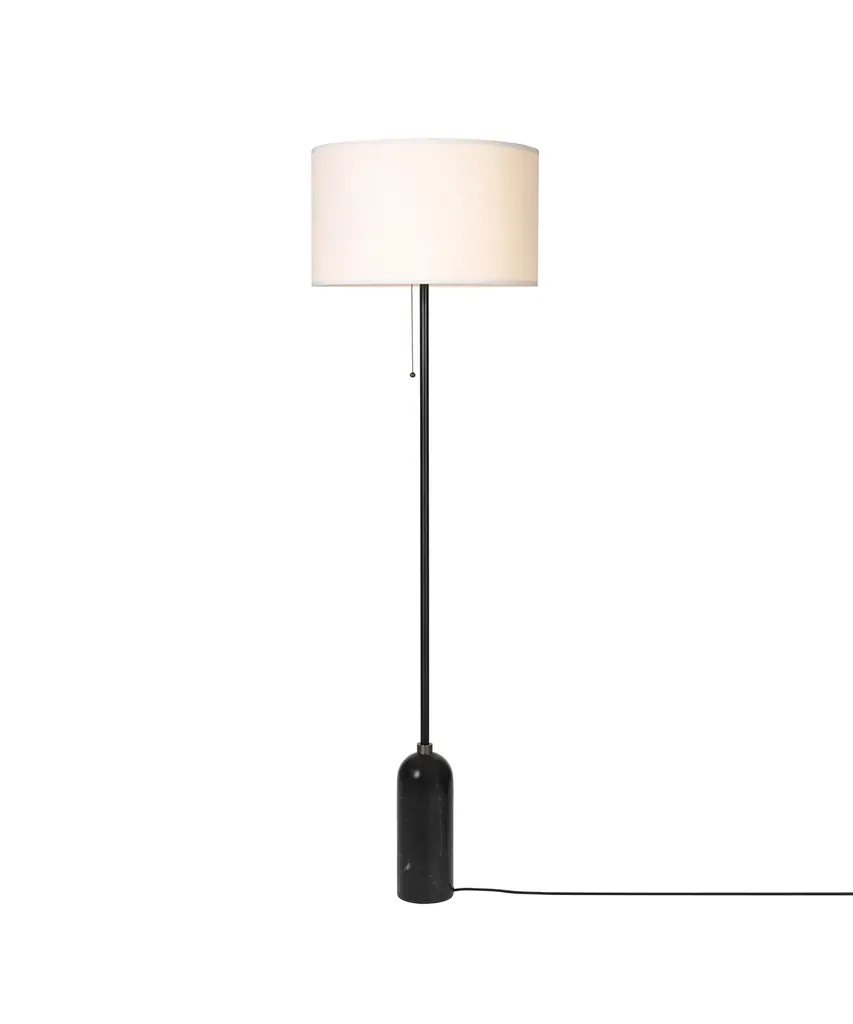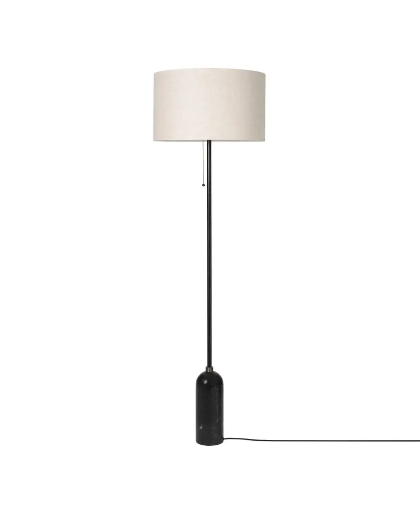 An effortless balance of contrasting materials and design styles. Anchored by a heavy, cylindrical base and contrasted by its lightweight, airy shades, the Gravity Floor Lamp emerges as a striking, sculptural whole. A base of blackened steel is paired with either a white or canvas shade. Designed by Space Copenhagen and produced in Denmark by Gubi - a Copenhagen-based purveyor of historic and contemporary designs.