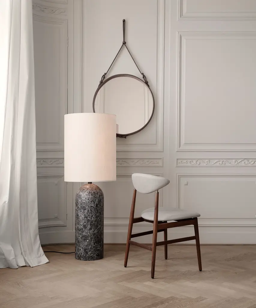 Taking its name from the lamp’s distinctive balance between the anchoring of the heavy, cylindrical base and the lightweight, airy shade, it beautifully merges into a sculptural whole. Blending understated elegance, clean functionality and effortless in its own succinct and simple way, the Gravity XL Floor Lamp gives an ambient and subtle light display and creates different moods and expressions depending on the choice of size and combination of materiality. Designed by Space Copenhagen for Danish design purveyor, Gubi.