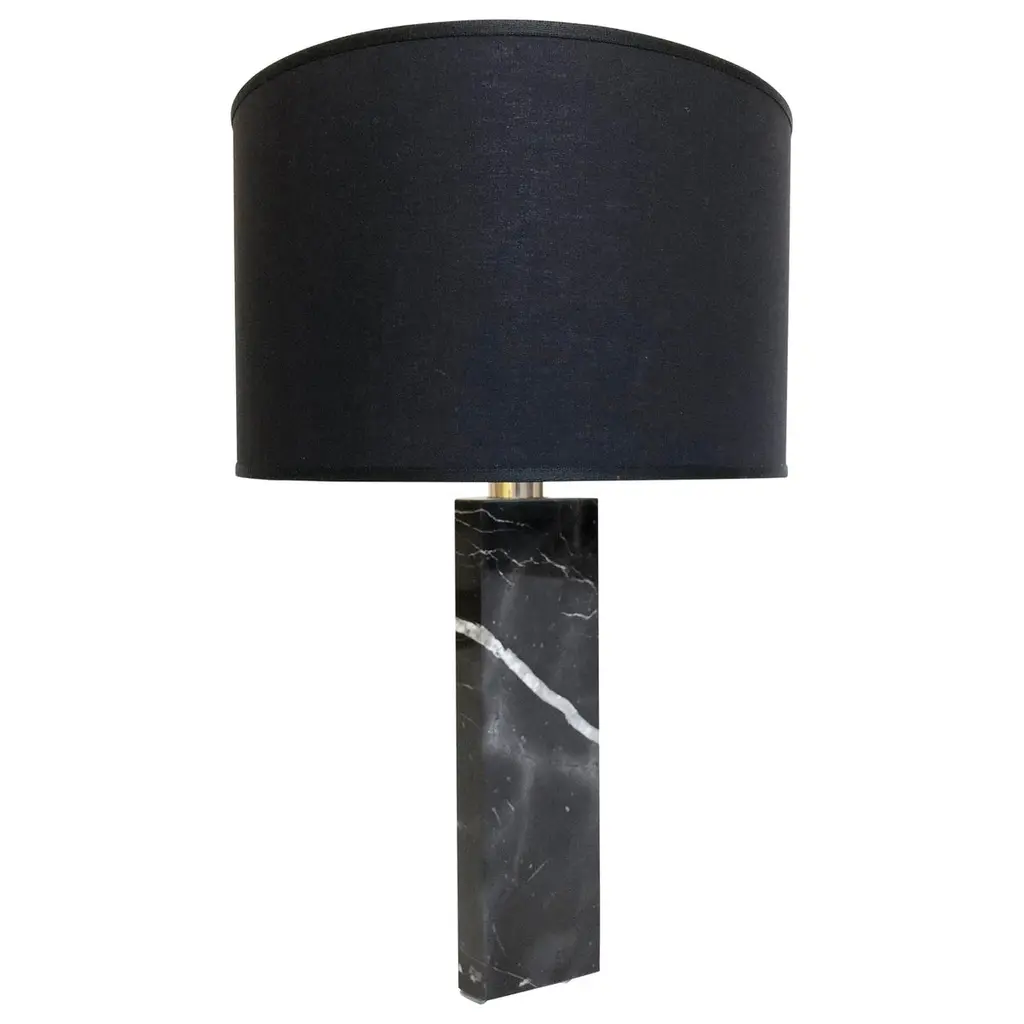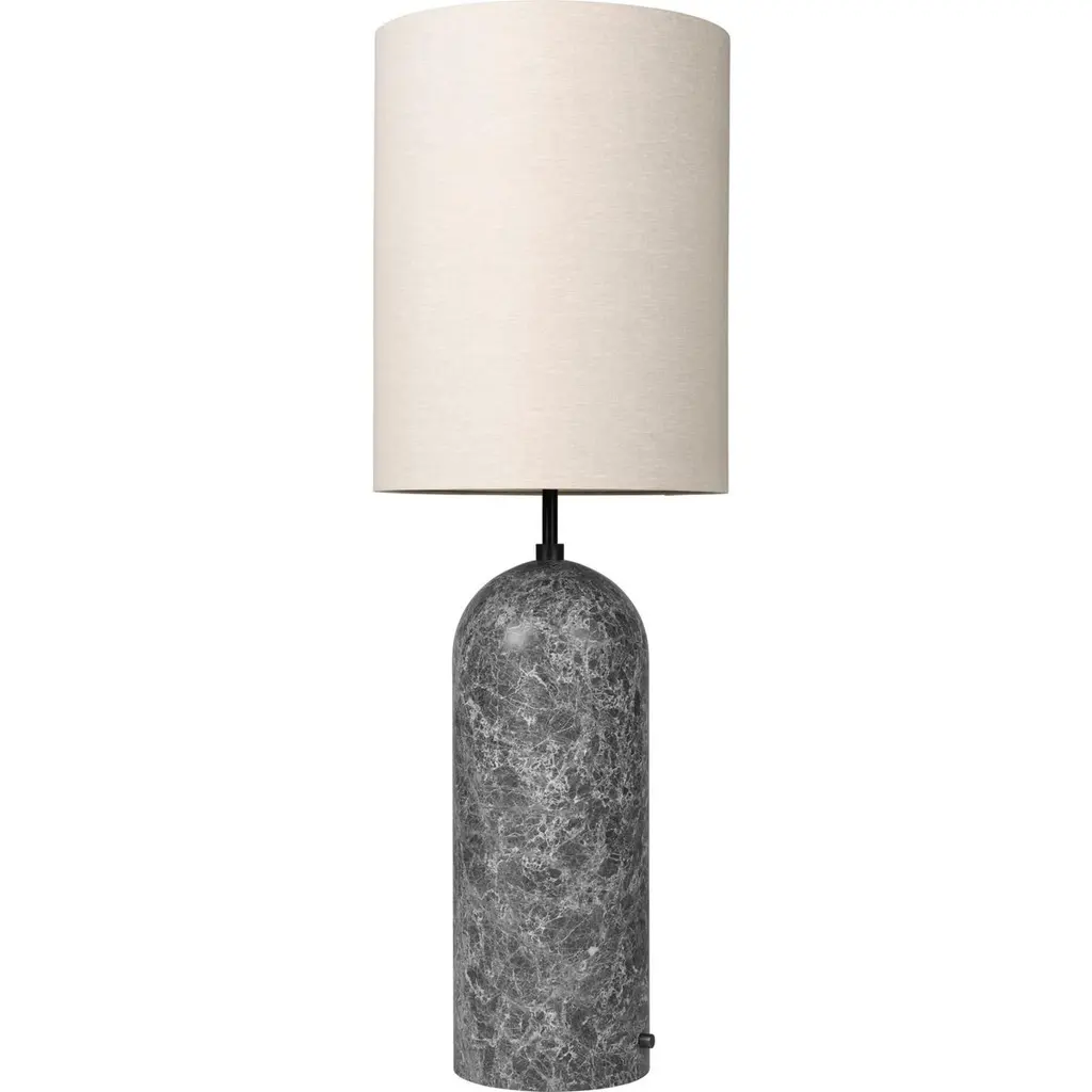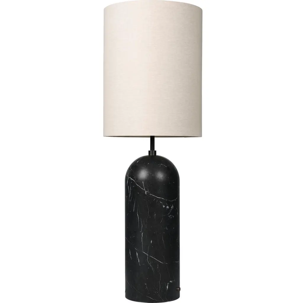 'Gravity XL High' floor lamp for Gubi in black marble with white shade.Executed in solid marble, with a black cloth cord and dimmer, the Gravity XL Floor Lamp designed by Space Copenhagen for GUBI contrasts strength and fragility. The lamp has a distinctive balance between the heavy, cylindrical base and the lightweight, airy shade that beautifully merges into a sculptural whole. The Gravity XL Floor Lamp casts an ambient light while serving as statement piece in any room.Established in 2005 by Signe Bindslev Henriksen and Peter Bundgaard Rützou, Space Copenhagen is a design studio working across multiple disciplines from furniture, lighting and refined objects, to art installations, art direction and interior design for private homes, hotels and restaurants all over the world. Price is per item. Available in unlimited quantities in choice of black, gray, or white marble base as well as choice of white textile or canvas shade.Accommodates 3x 60W equivalent standard medium base (e26) LED bulbs (lower with incandescent). UL listed. Please note that marble can vary from item to item due to the organic nature of the material.In-stock lead time 2-3 weeks. For out of stock orders, add an additional 2-3 weeks or more. Can take up to 10 weeks or more. Inventory availability subject to change at any time. For time-sensitive orders, please inquire prior to purchasing.Made to order. All sales are final.