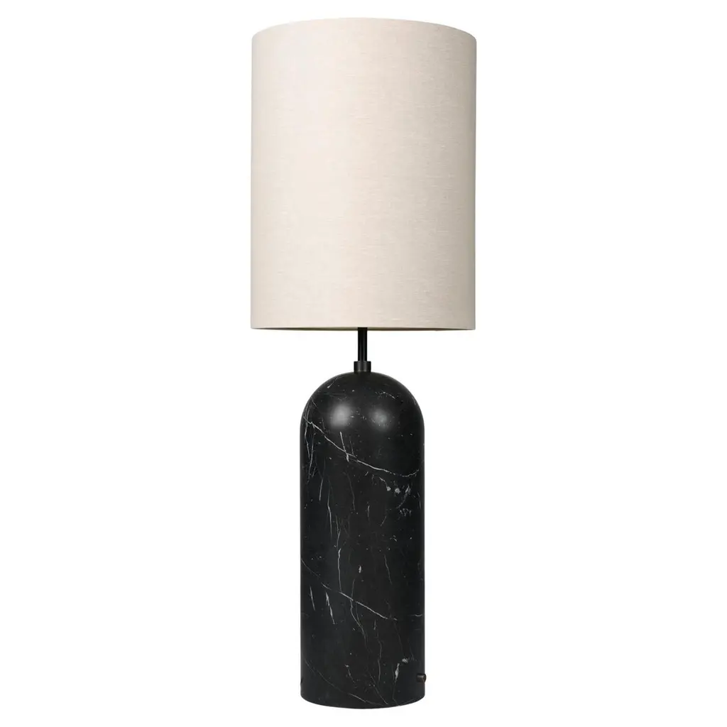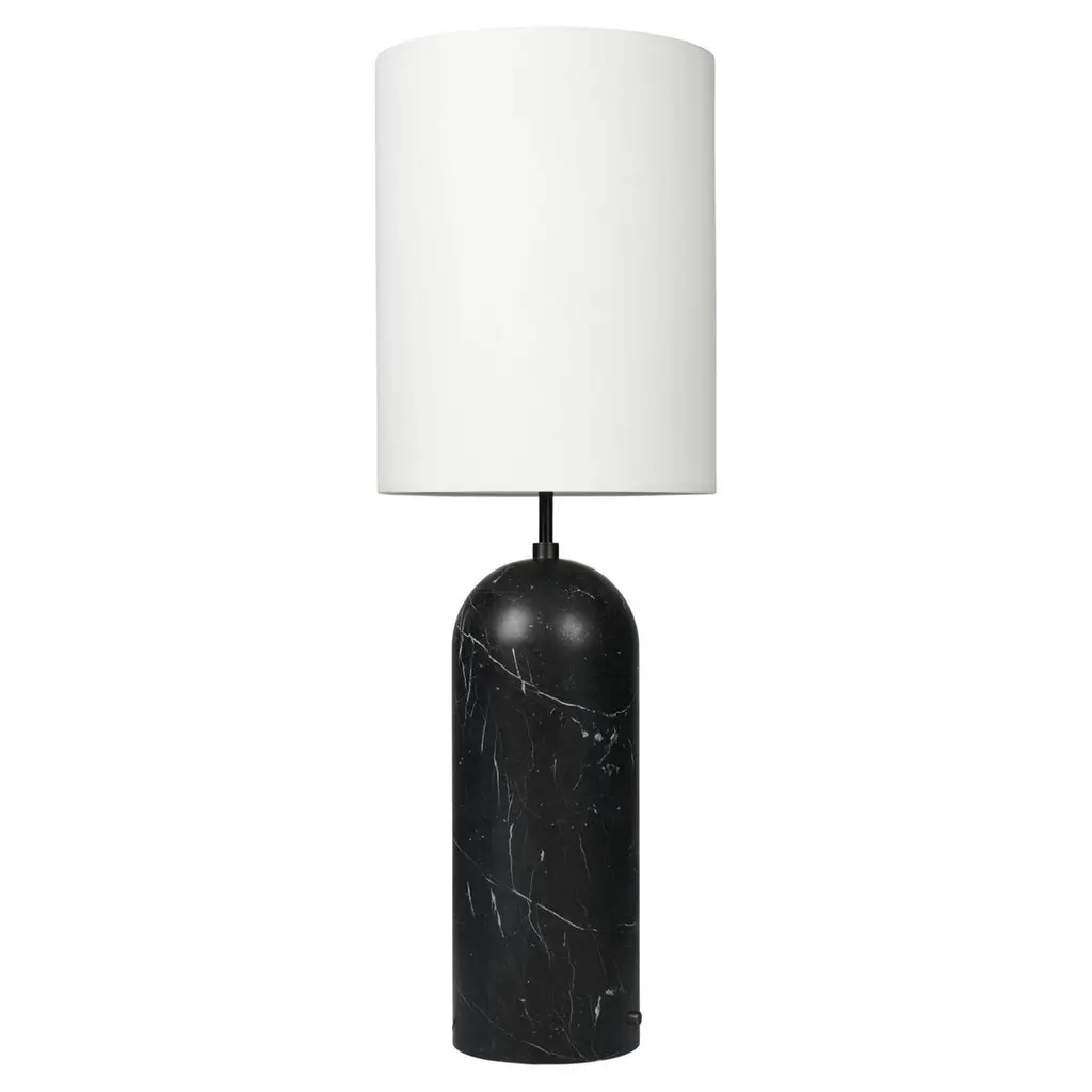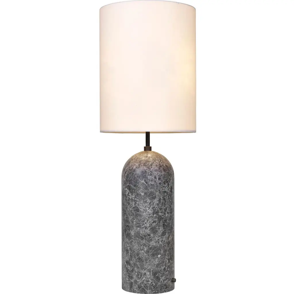 'Gravity XL High' Floor Lamp for Gubi in Gray Marble with White Shade.Executed in solid marble, with a black cloth cord and dimmer, the Gravity XL Floor Lamp designed by Space Copenhagen for GUBI contrasts strength and fragility. The lamp has a distinctive balance between the heavy, cylindrical base and the lightweight, airy shade that beautifully merges into a sculptural whole. The Gravity XL Floor Lamp casts an ambient light while serving as statement piece in any room.Established in 2005 by Signe Bindslev Henriksen and Peter Bundgaard Rützou, Space Copenhagen is a design studio working across multiple disciplines from furniture, lighting and refined objects, to art installations, art direction and interior design for private homes, hotels and restaurants all over the world. Price is per item. Available in unlimited quantities in choice of black, gray, or white marble base as well as choice of white textile or canvas shade.Accommodates 3x 60W equivalent standard medium base (e26) LED bulbs (lower with incandescent). UL listed. Please note that marble can vary from item to item due to the organic nature of the material.In-stock lead time 2-3 weeks. For out of stock orders, add an additional 2-3 weeks or more. Can take up to 10 weeks or more. Inventory availability subject to change at any time. For time-sensitive orders, please inquire prior to purchasing.Made to order. All sales are final.