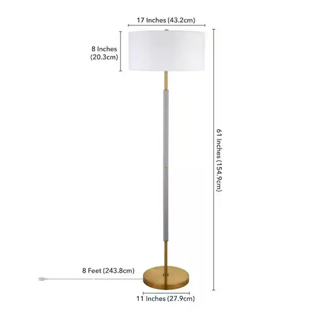 Add visual interest to any room with this 2-toned contemporary floor lamp. On-trend neutral colors are perfectly paired with lustrous metallic accents to elevate your design scheme. Its generous French drum shade holds space for 2-bulbs to cast extra light wherever its needed. Highlights Handcrafted finish in 2 complementary tones Paired with a French drum shade Shade is in a crisp chiffon color and is made of 100% linen with polystyrene lining for durability Rated for two 100-Watt incandescent bulbs, 9-Watt LED bulbs, 23-Watt fluorescent (CFL) bulbs, or 9-Watt self-ballasted LED bulbs, E26-base bulbs Includes an 8 ft. cord Dual rotary socket switches Clean with a soft, dry cloth, no harsh chemicals or abrasive cleaning materials