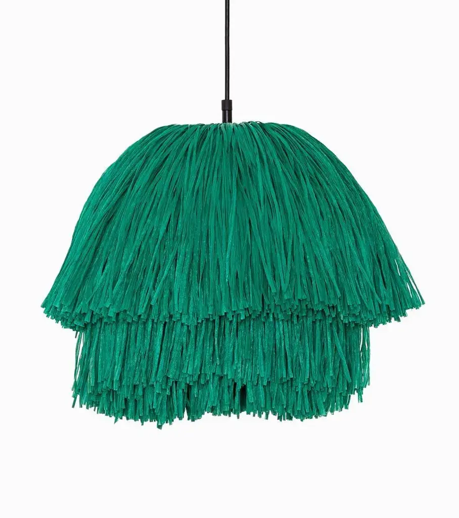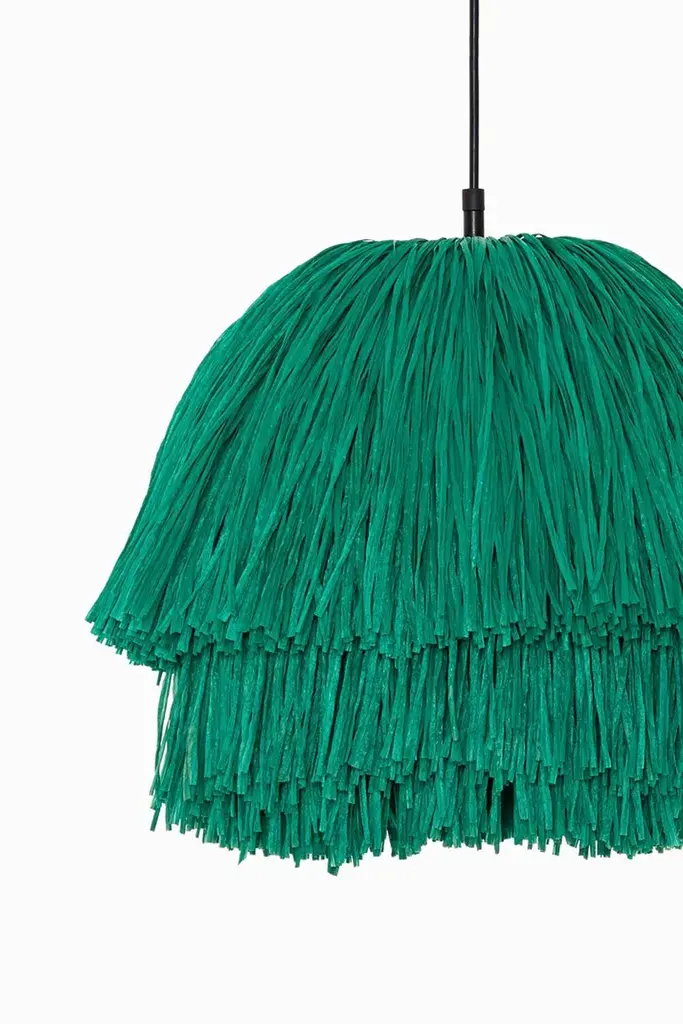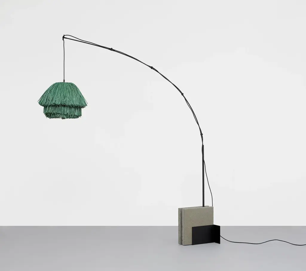 Green fran s stand floor lamp by llot llov handcrafted light object dimensions: d 40 x w 205.8 x h 250 cm materials: raffia fringes, glass fiber, steel, concrete colour: green also available in beige, coral, black. Another member of the fran family is the floor lamp fran stand. The pole that supports the frans lamp body is made of glass fiber and is plugged together according to the tent pole principle. It is thus flexible so that the lamp begins to swing in the wind or when touched. The base that holds the lamp is made of powder-coated steel. For the necessary weight, but also for the individual style, the base consists of two compartments into which classic concrete floor plates are embedded for weighting. But any other stone slab in a suitable format can also be used for weighting and design. With their bulky silhouette and rustling fringes, the fran lights are reminiscent of a piñata. While their cable becomes the suspension string, their fluttering body is made of high-quality rayon, a viscose fibre based on cellulose. The fringe strands are fitted in layers and create a subtle bob or a bulky statement piece – depending on the amount of material. Fran is available in four bold block colours (beige, red, green and black), which work on their own as in monochrome or contrasting combinations as well. Despite their volumes, the shades can be folded flat for shipment. Behind the llot llov brand is the studio for product and interior design as well as the producer of furniture, objects, lighting and surfaces. Since their foundation in 2006 by ania bauer and jacob brinck, the two berlin based author designers have established themselves internationally. One of their recognizable features is the reinterpretation of traditional arts and crafts brought into a contemporary design context. An example of this is osis, an innovative surface finish using salt crystals and colour pigments on wood, with which they won the german materials prize, among other awards. They use osis as well as the terrazzo glacier, which was introduced in 2018 and is made of nail polish bottles, for their own designs, but they also supply interior designers worldwide. For glacier, as for other designs, they upcycle high-quality materials, for example from the cosmetics industry. Their objects are manufactured in europe, often in social workshops, and distributed directly by llot llov. Llot llov produce exclusive furniture and objects for private or corporate clients and also manage interior design projects such as hotels or offices. In addition, the duo has been running a shop for fashion and accessories in berlin-mitte with baerck since 2007. up to 250v (europe/uk standard).