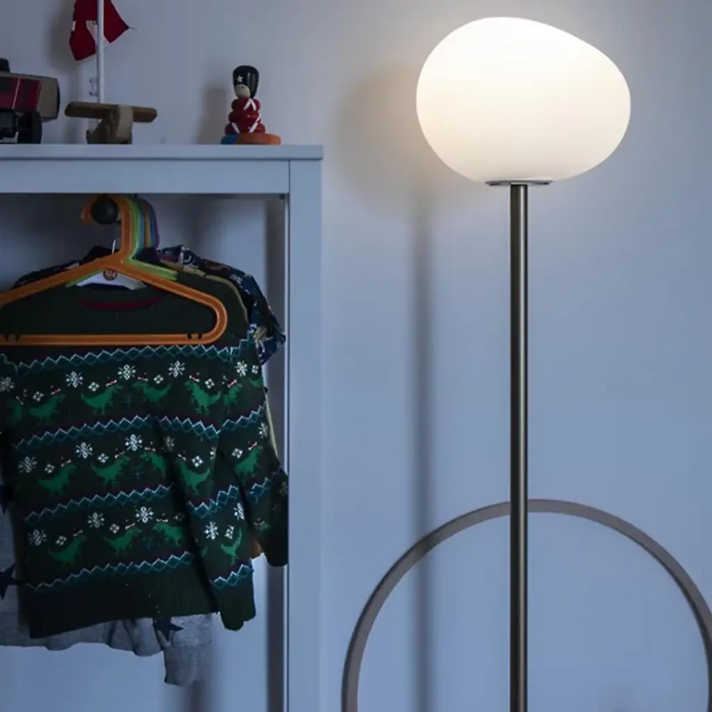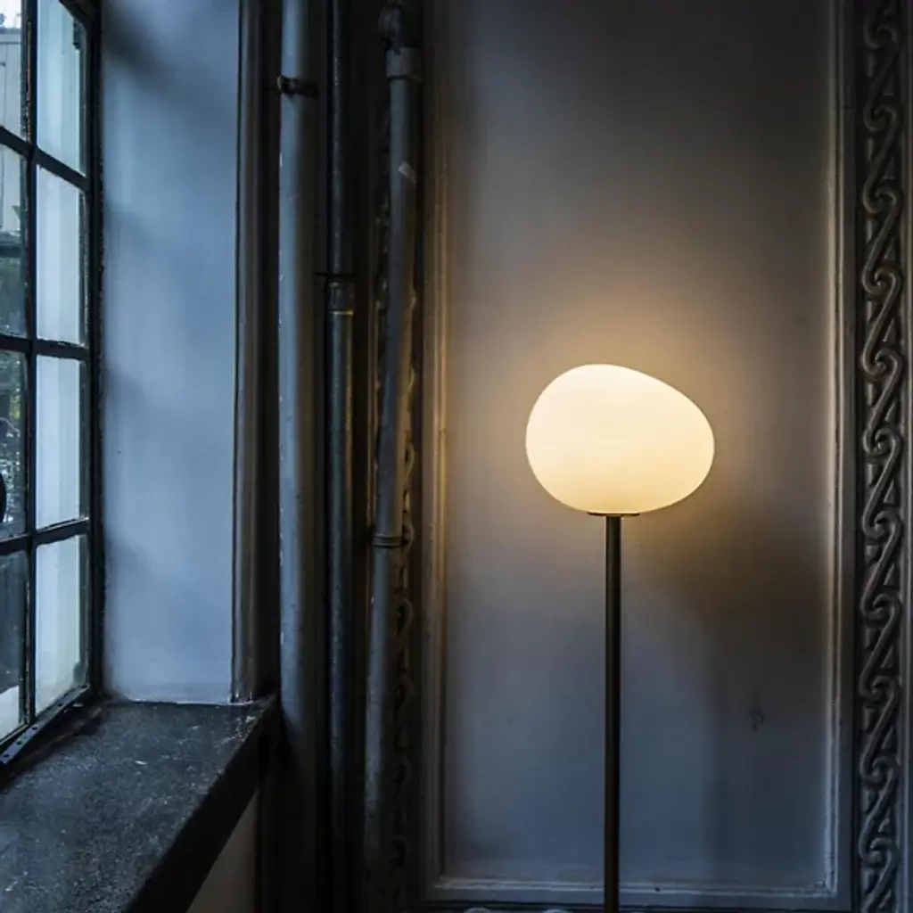 Invite the calming presence of the Gregg Floor Lamp from Foscarini into your home. Made of blown glass, the shade adds depth and grace to an already elegant home with a series of acid-etched lines that undulate across the surface. Designed by Ludovica and Roberto Palomba, this piece consists of a thin body, a wide base, and the shade itself, shaping into a pleasing and dynamic form reminiscent of a smoothed pebble. The light emanates out in a warm and welcoming manner, soothing the senses and elevating the atmosphere.