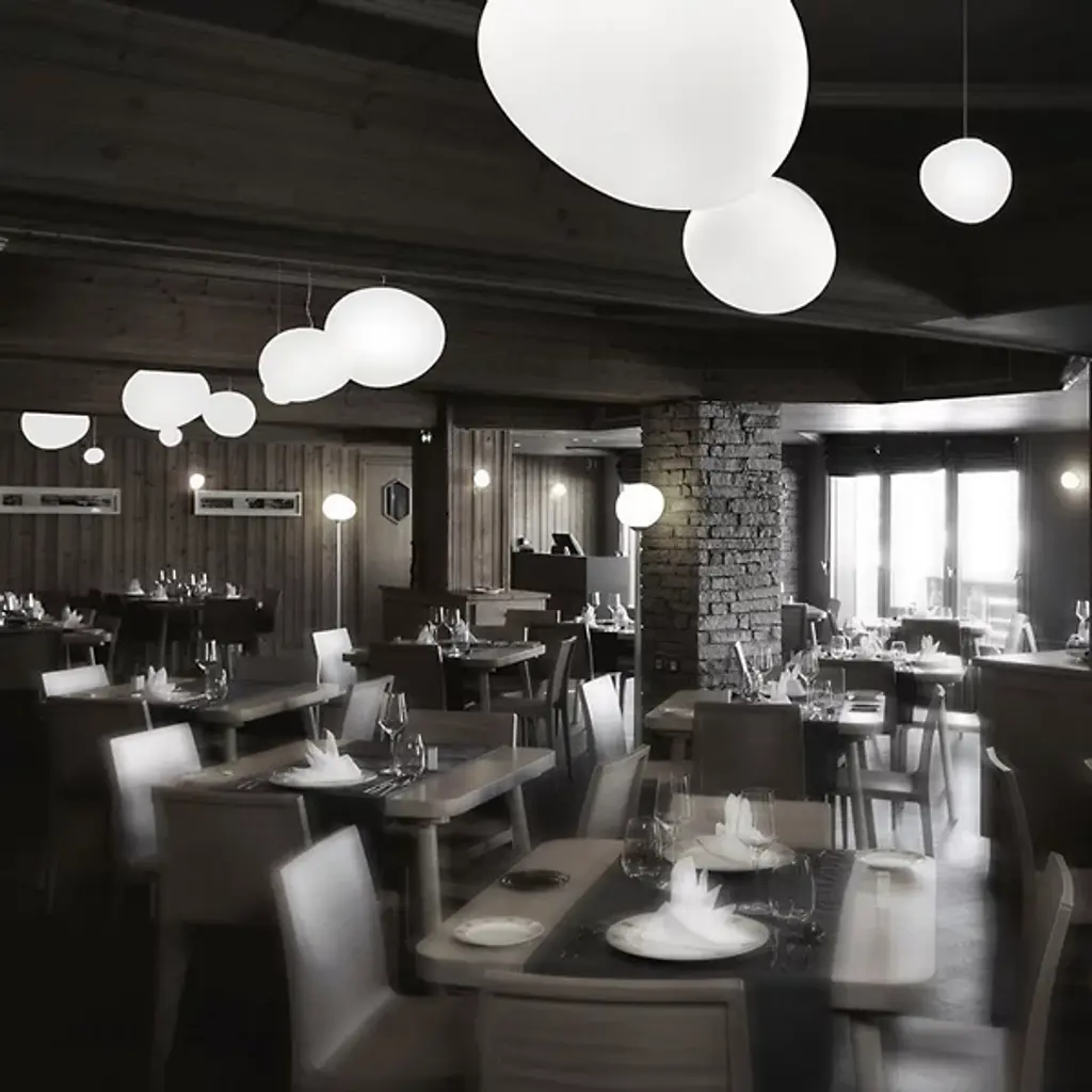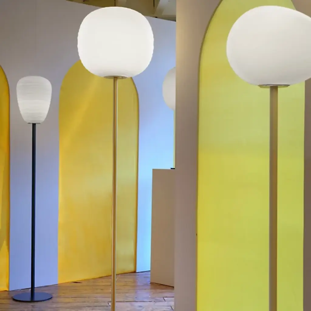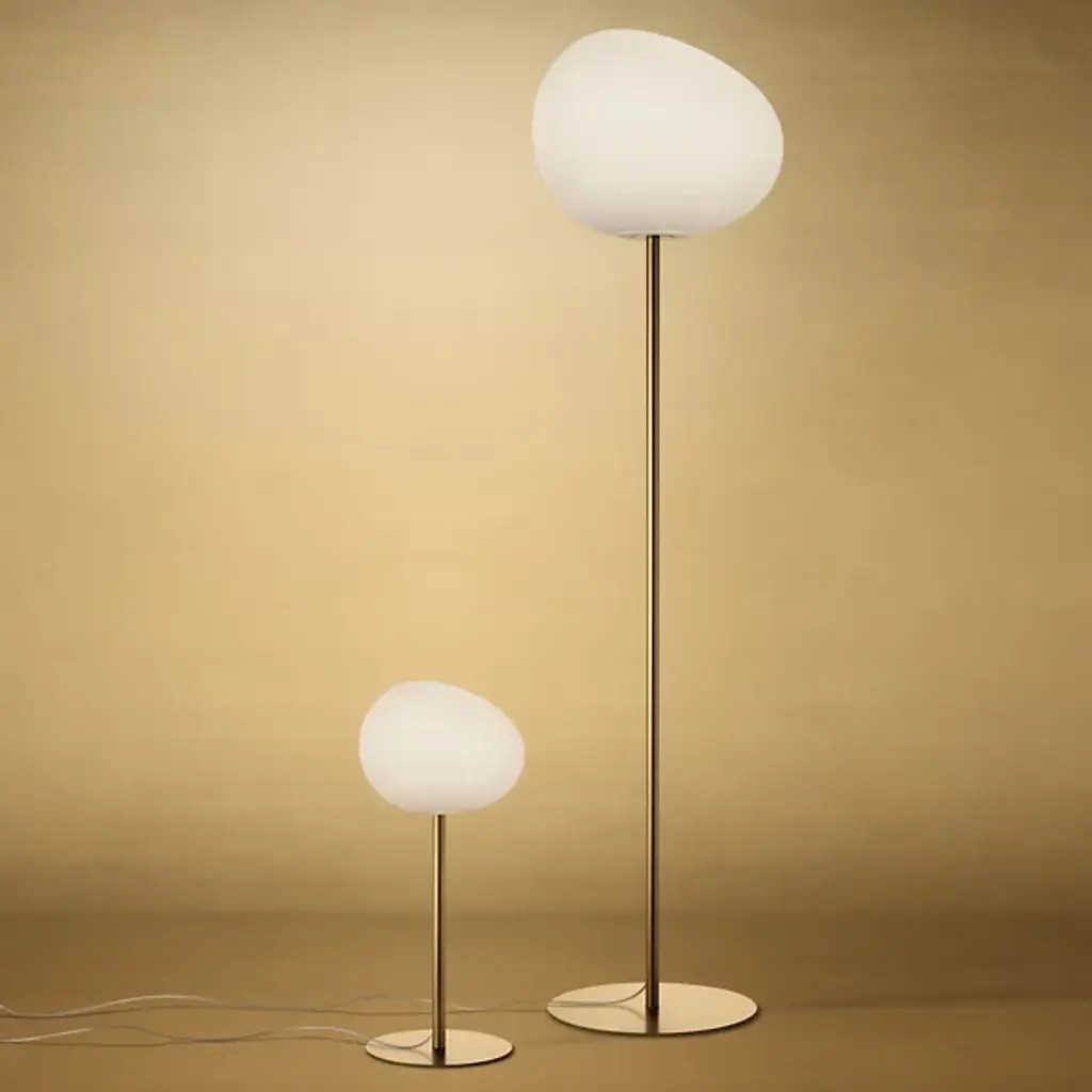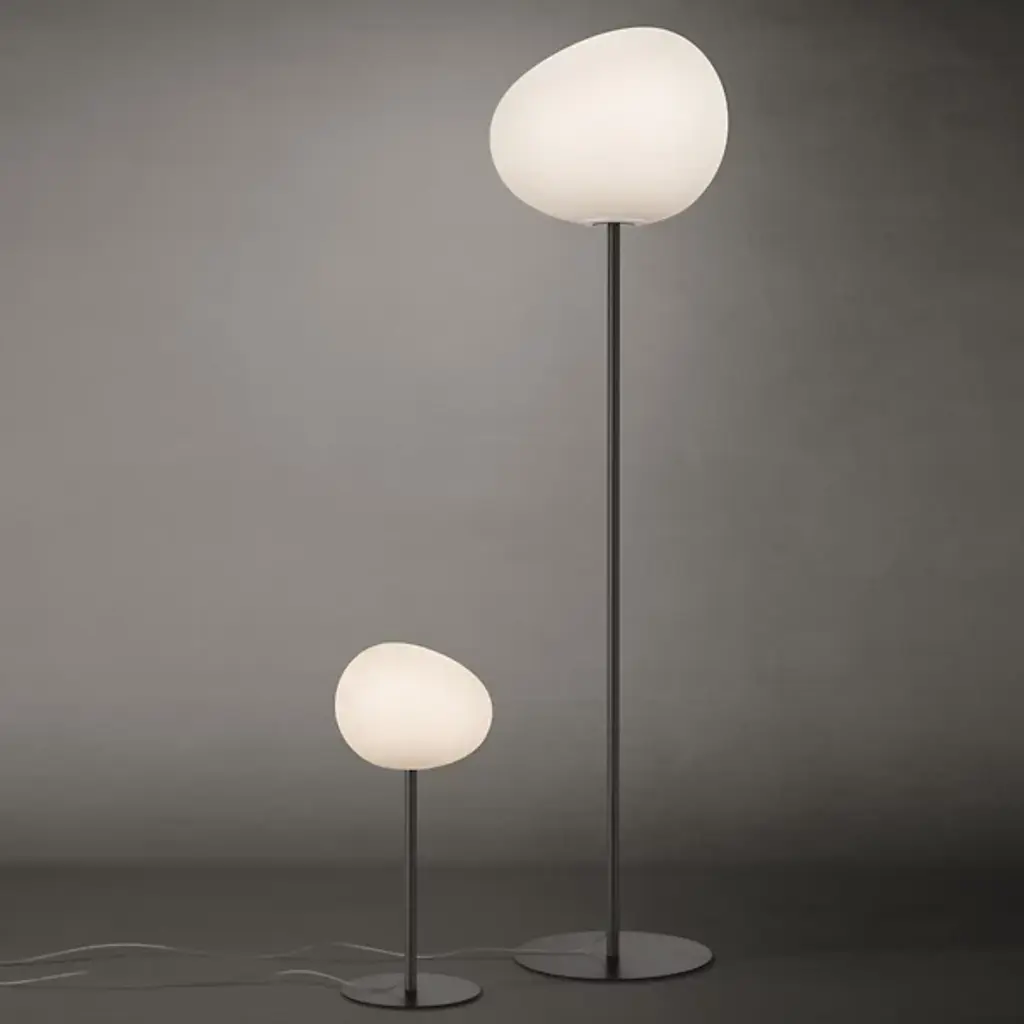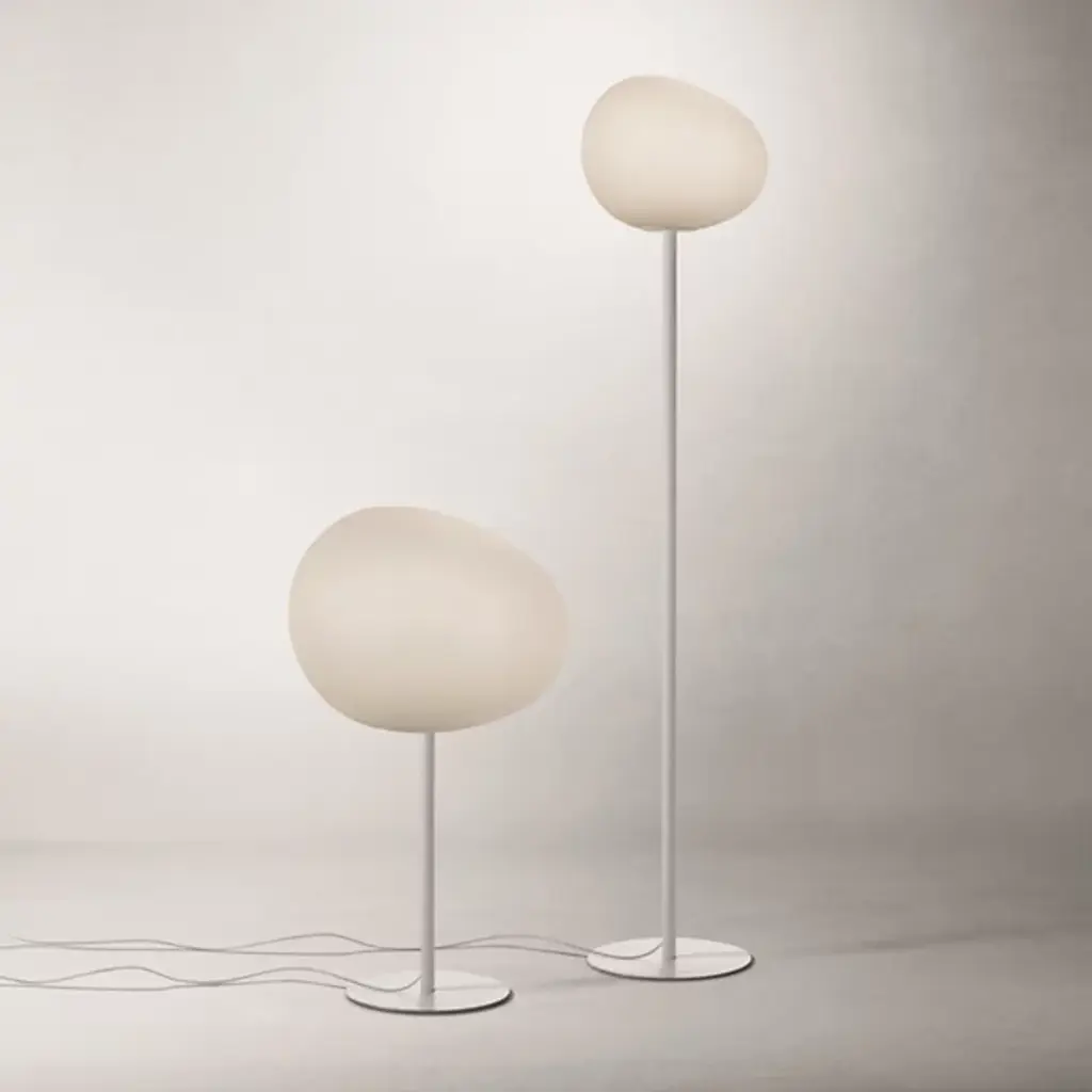 Invite the calming presence of the Gregg Floor Lamp from Foscarini into your home. Made of blown glass, the shade adds depth and grace to an already elegant home with a series of acid-etched lines that undulate across the surface. Designed by Ludovica and Roberto Palomba, this piece consists of a thin body, a wide base, and the shade itself, shaping into a pleasing and dynamic form reminiscent of a smoothed pebble. The light emanates out in a warm and welcoming manner, soothing the senses and elevating the atmosphere.