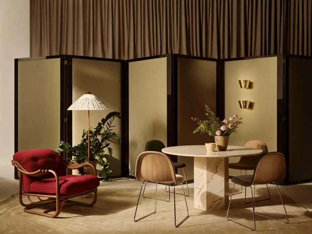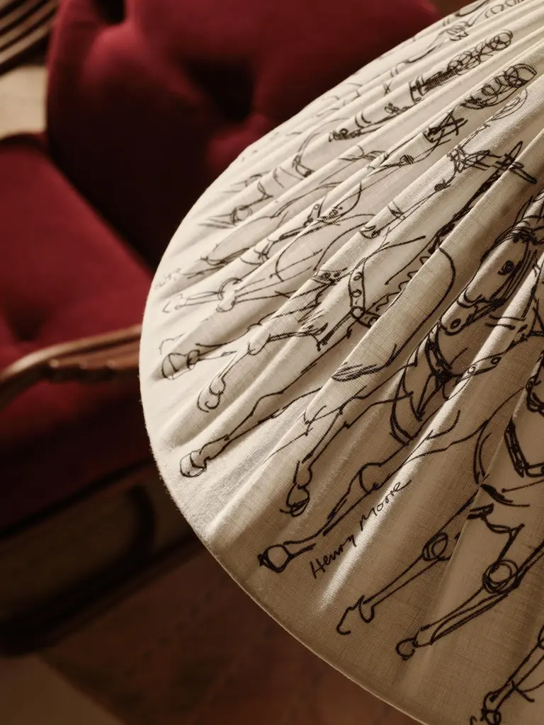 By Paavo TynellGUBI X GARRO ÉDITIONS 9602Special EditionThe 9602 Floor Lamp, also known as “Chinese Hat” was designed by Paavo Tynell in 1938 for the hotel Aulanko. Characterised by its elegant and airy lampshade and rattan-covered stem, the 9602 Floor Lamp shows the designer’s limitless imagination and unparalleled ability to create designs of enduring beauty. Adding a playful, exuberant quality to the top, balanced by the more static form of the base, the 9602 Floor Lamp is perfectly suited for creating a gentle ambient light in the domestic living room.In a new collaboration, GUBI and the boutique Parisian textile house GARRO ÉDITIONS bring together Paavo Tynell and another pioneering figure of the 20th-century: Revered English sculptor and artist Henry Moore. This special edition combines the classically Scandinavian elegance of Tynell's 9602 Floor Lamp with the dynamic energy of Moore’s black-line drawings.Moore’s bold, fluid lines bring a striking dynamism to the lamp. The interplay of his expressive strokes and the shade’s pleats adds an almost three-dimensional depth, capturing the tension and movement within the artwork. The horses seem poised to leap from the linen surface and into the room, giving a kinetic freshness to Tynell’s refined design. ‘Just as art reflects society, so does great design. Like Henry Moore, Paavo Tynell was drawn to nature, organic forms, and classic materials. Almost a century after its creation, the lamp remains as relevant as ever.’ – Héloïse Garro, founder, GARRO ÉDITIONSHARINGEY CIRCUS HORSES BY HENRY MOORE Henry Moore was fascinated by horses and other livestock, and returned to them as inspiration for studies, sketches, and other artworks throughout his career. Personally selected by GARRO ÉDITIONS founder Héloïse Garro on a visit to the Henry Moore Foundation’s archive, The 9602 special edition is adorned with ‘Haringey Circus Horses’, a spontaneous pen-and-ink drawing created by Henry Moore in 1956 during a trip to the circus with his daughter. The drawing portrays the electric moment when the horses first step out into the ring, full of anticipation.