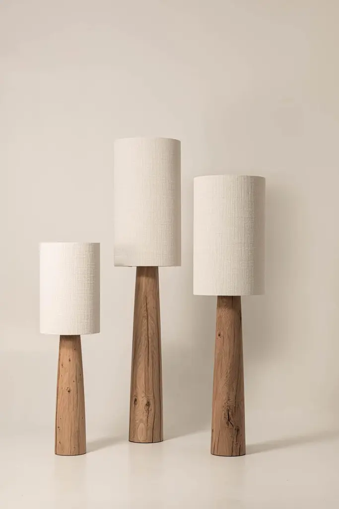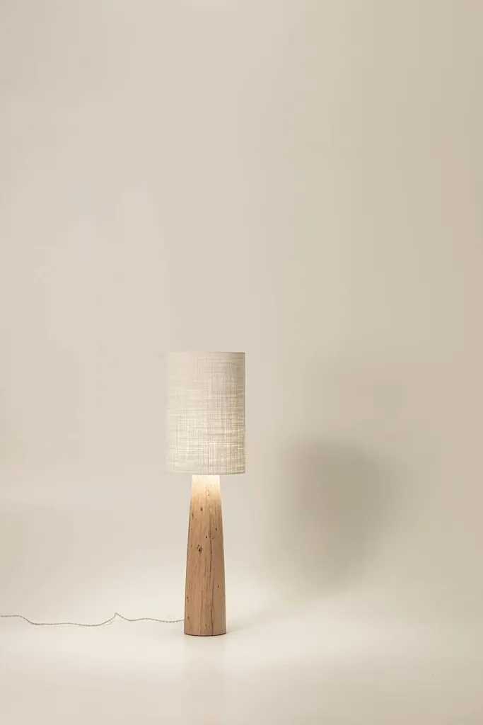 Guma FL4L lamp by Jeroen De RuddereDimensions: D 33 x H 120 cmCord Lenght: 175 cmDimmable: YesMaterials: Oak Brutal nature and textile.All pieces are CE certified.Each lamp is handmade so the measurements may differ minimally.